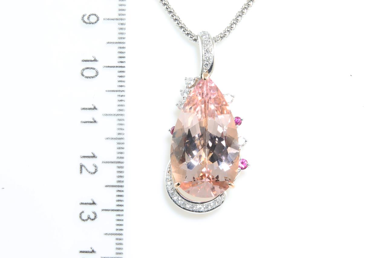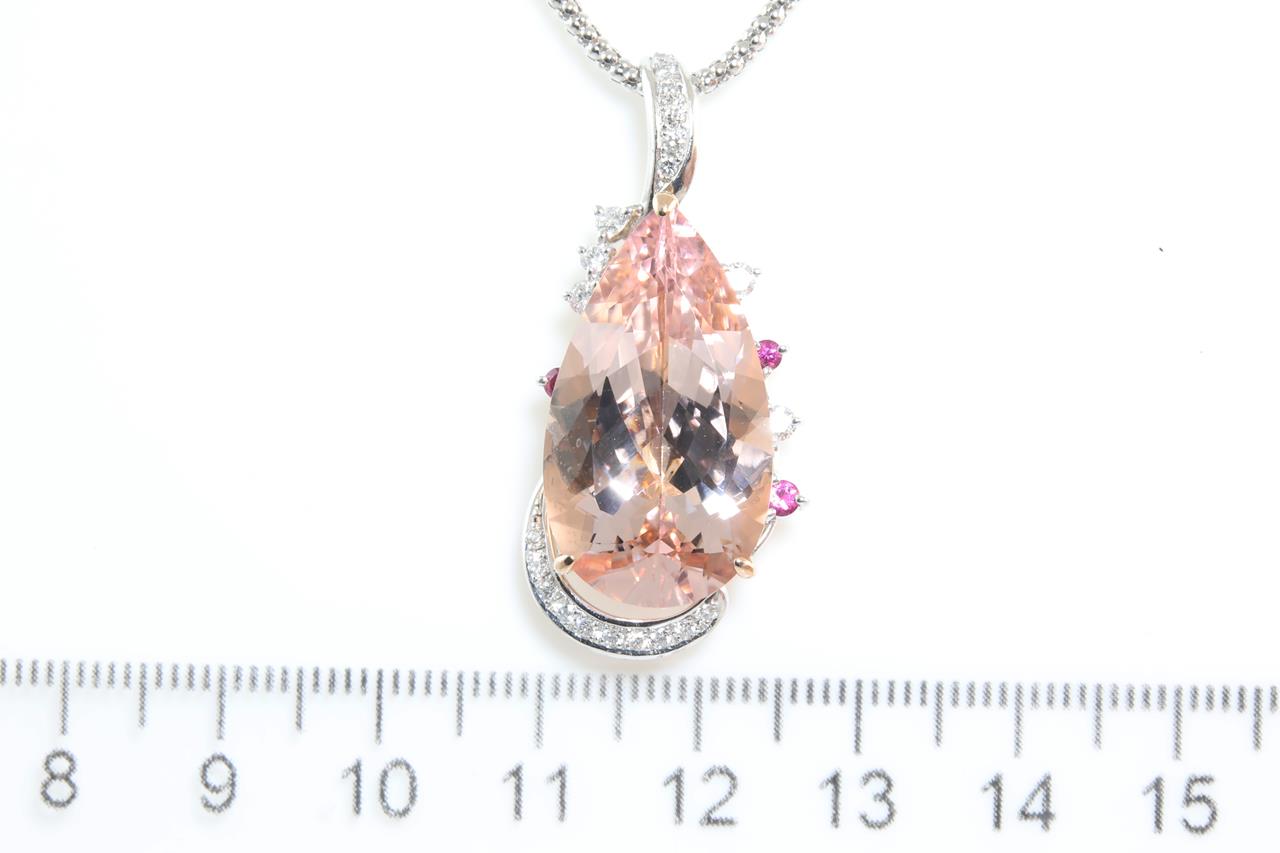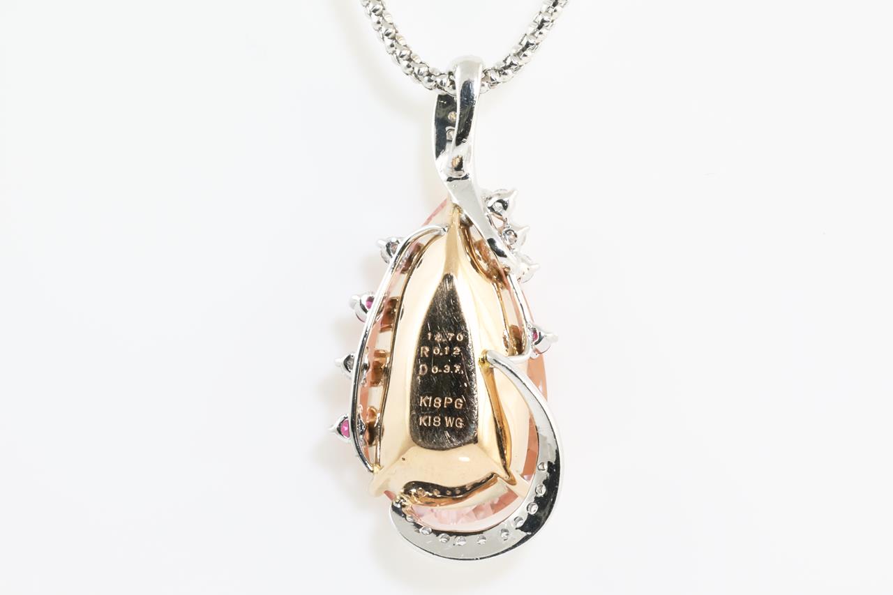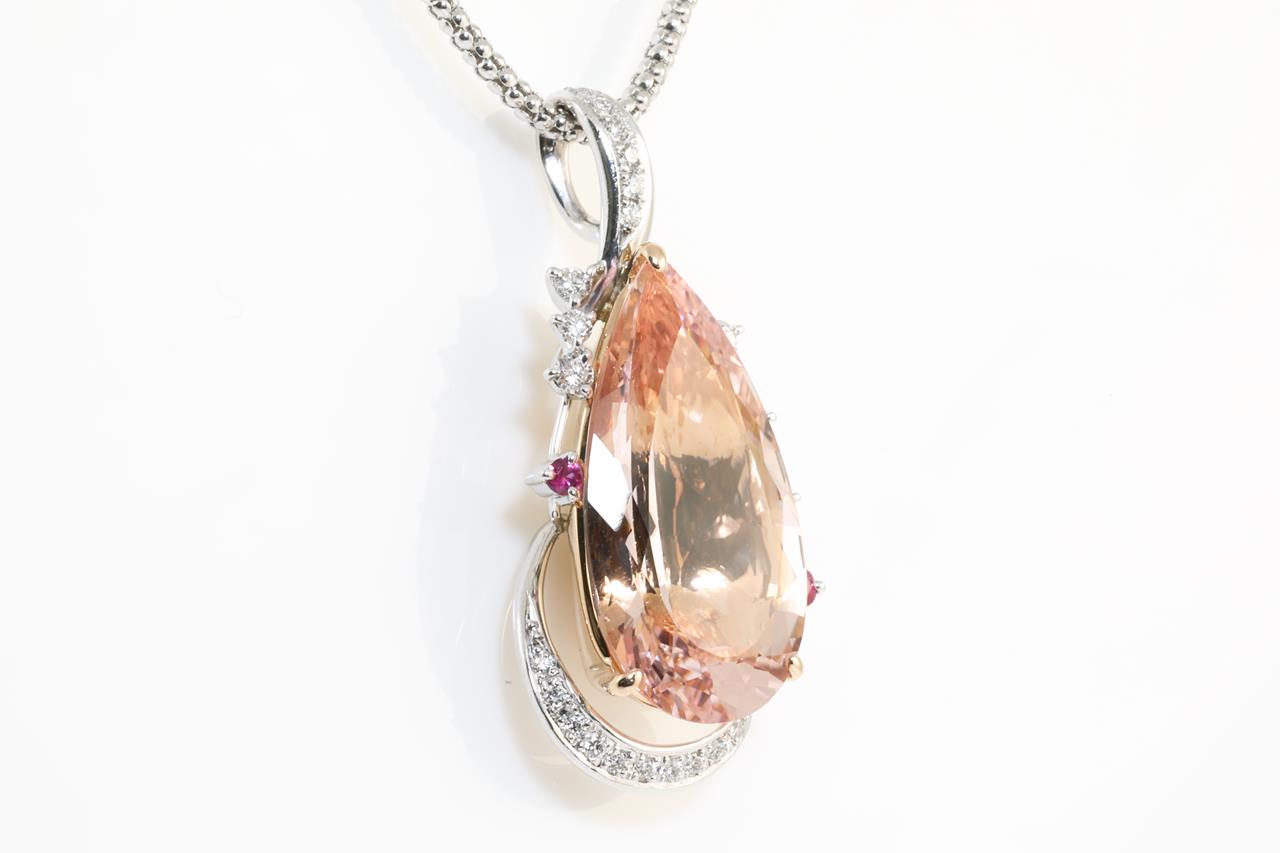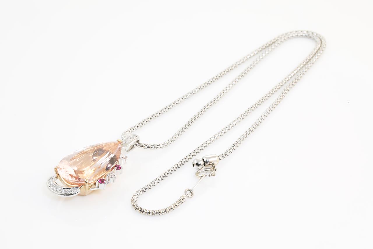 Morganite and Diamond pendant with a pear shape Morganite of 14.70ct, Rubies totalling 0.12cts and Diamonds totalling 0.37cts (Estimated grading: H SI). 18ct rose gold and white gold. With 44cm white gold adjustable chain. Weight: 16.3gm. (Pre-owned)