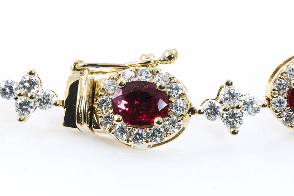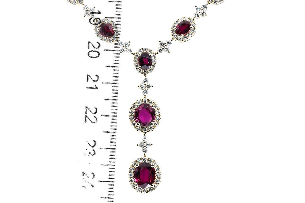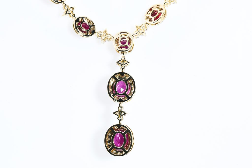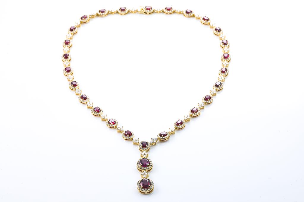 Ruby and Diamond necklace with oval Rubies totalling 14.72cts and round Diamonds totalling 6.68cts (Estimated grading: H-I SI). 18ct yellow gold. Length 40cm. Weight: 31.6g. With Certificate #415811. (Pre-owned)