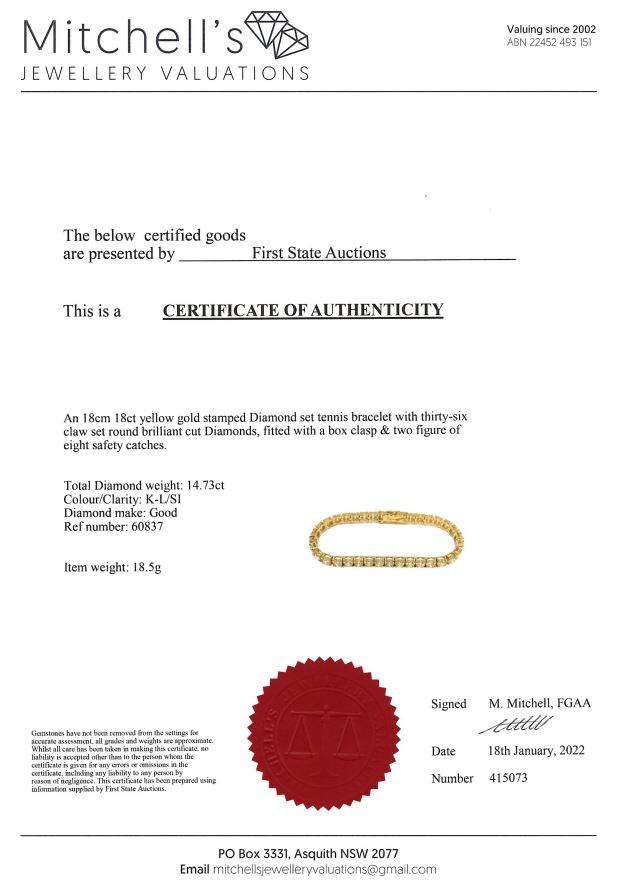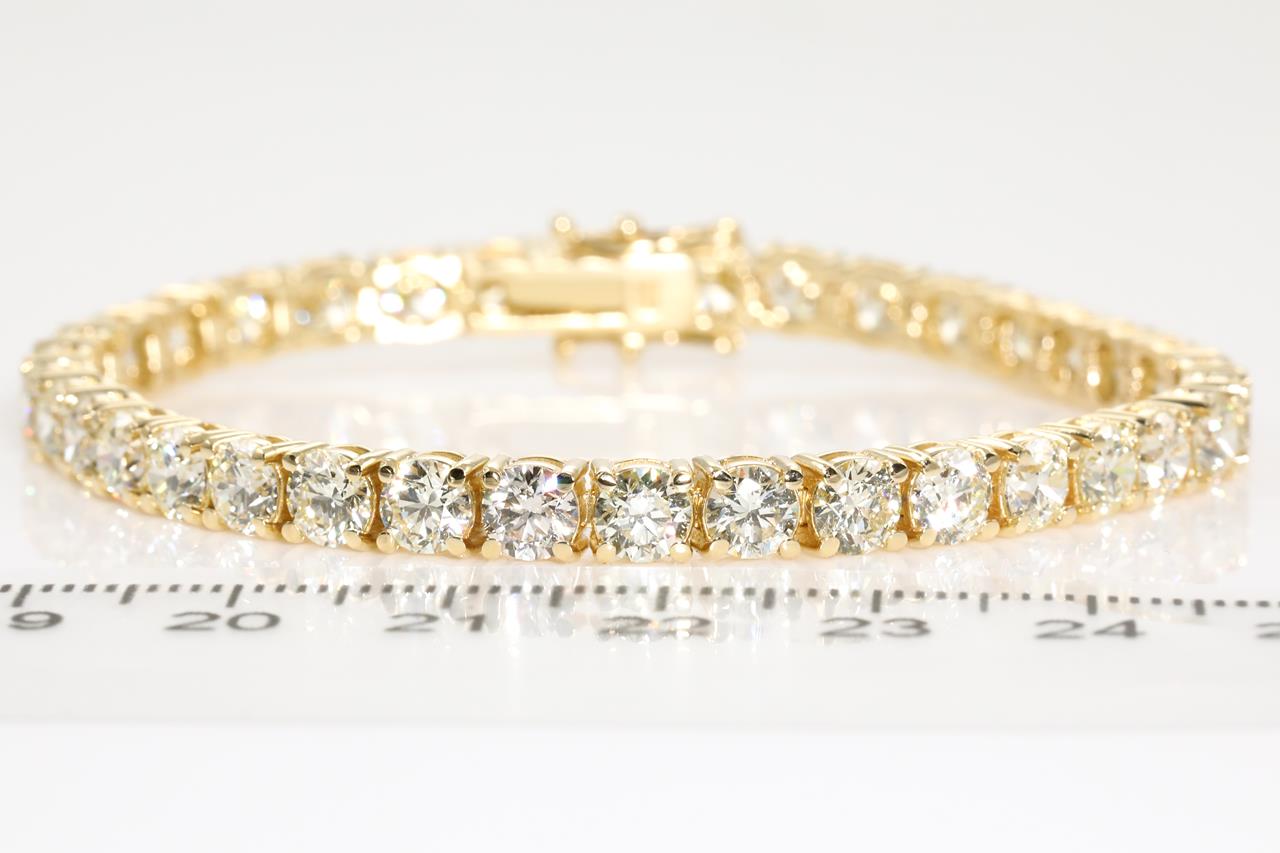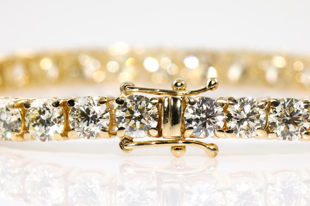 Diamond tennis bracelet with 36 round Diamonds totalling 14.73cts (Estimated grading: K-L SI). 18ct yellow gold. Length: 18cm. Weight: 18.5g. With certificate #415073. (New)