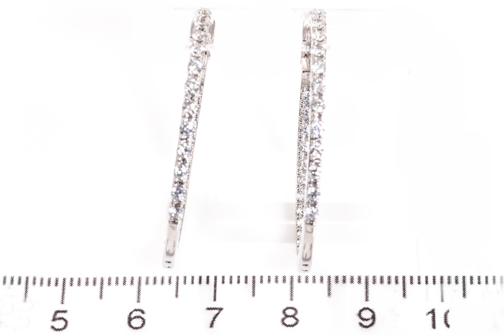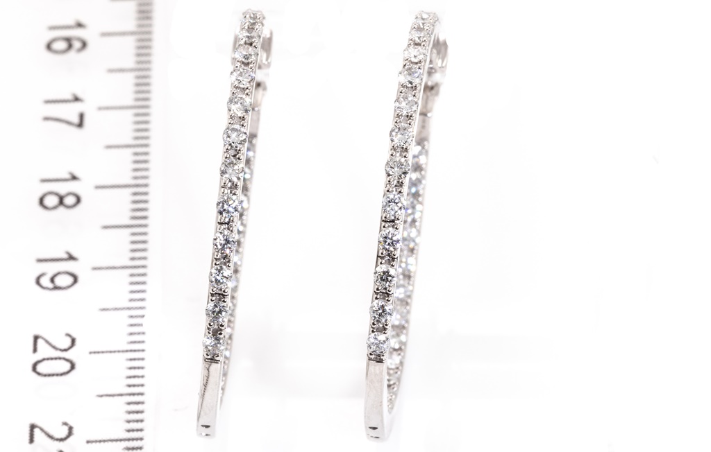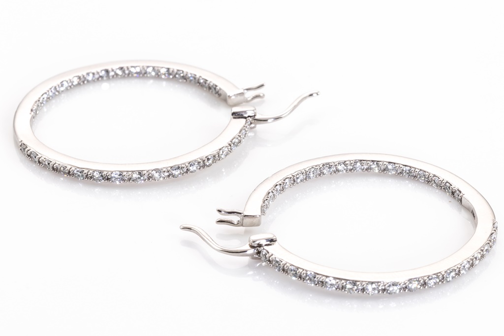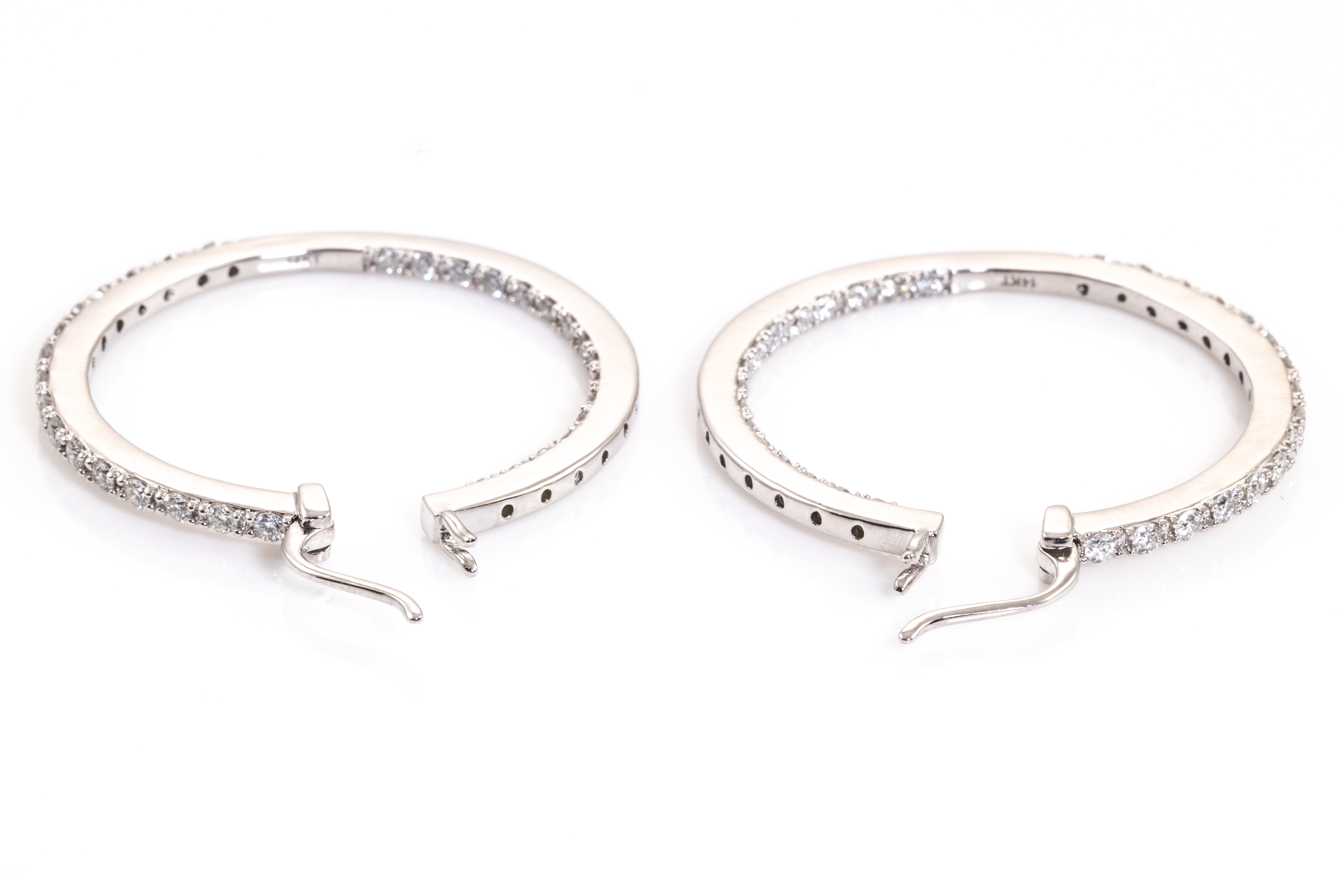 Diamond hoop earrings with round Diamonds totalling 1.47cts (Estimated grading: G SI). 14ct white gold. Weight: 11.3g. (New)