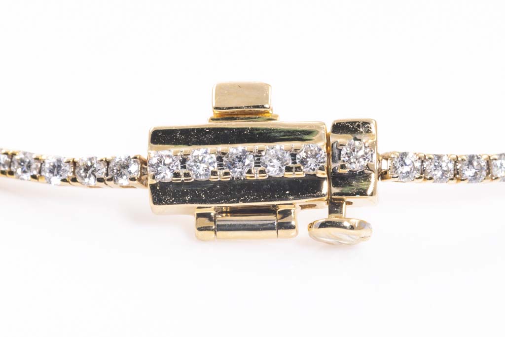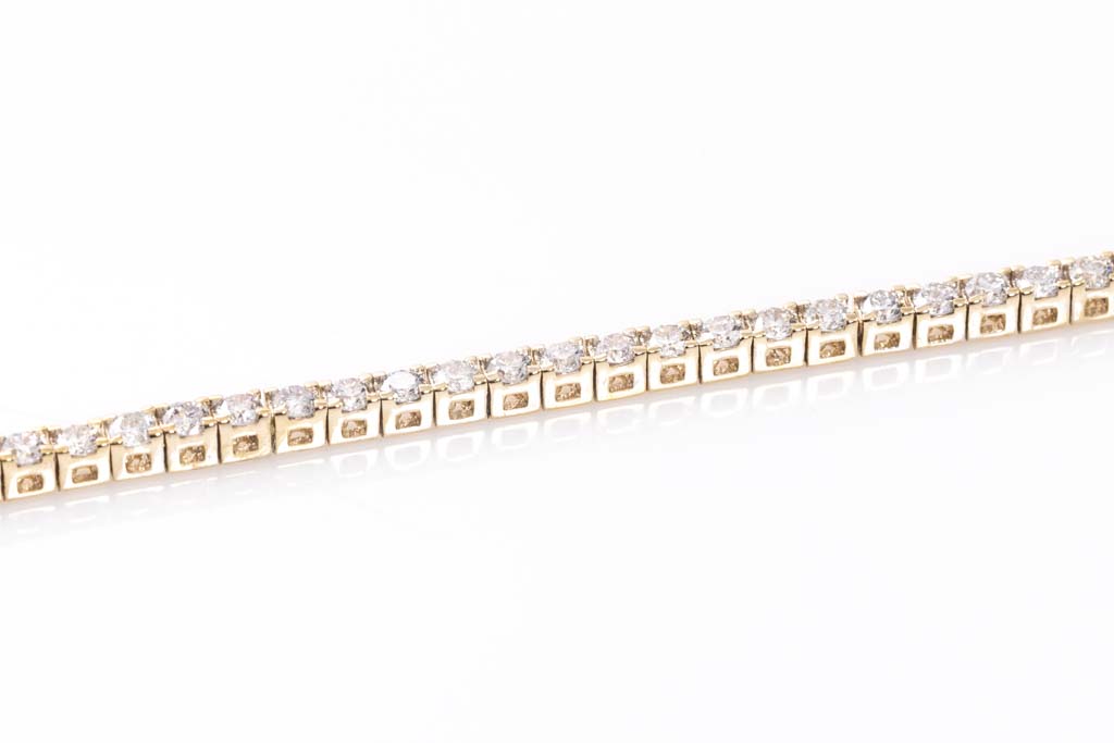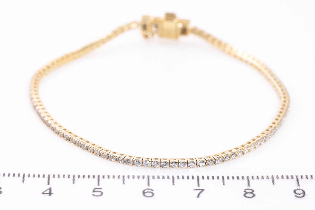 Diamond tennis bracelet with 99 round Diamonds totalling 1.47cts (Estimated grading: H SI). 14ct yellow gold. Length: 18cm. Weight: 5.0g. (As New)