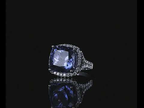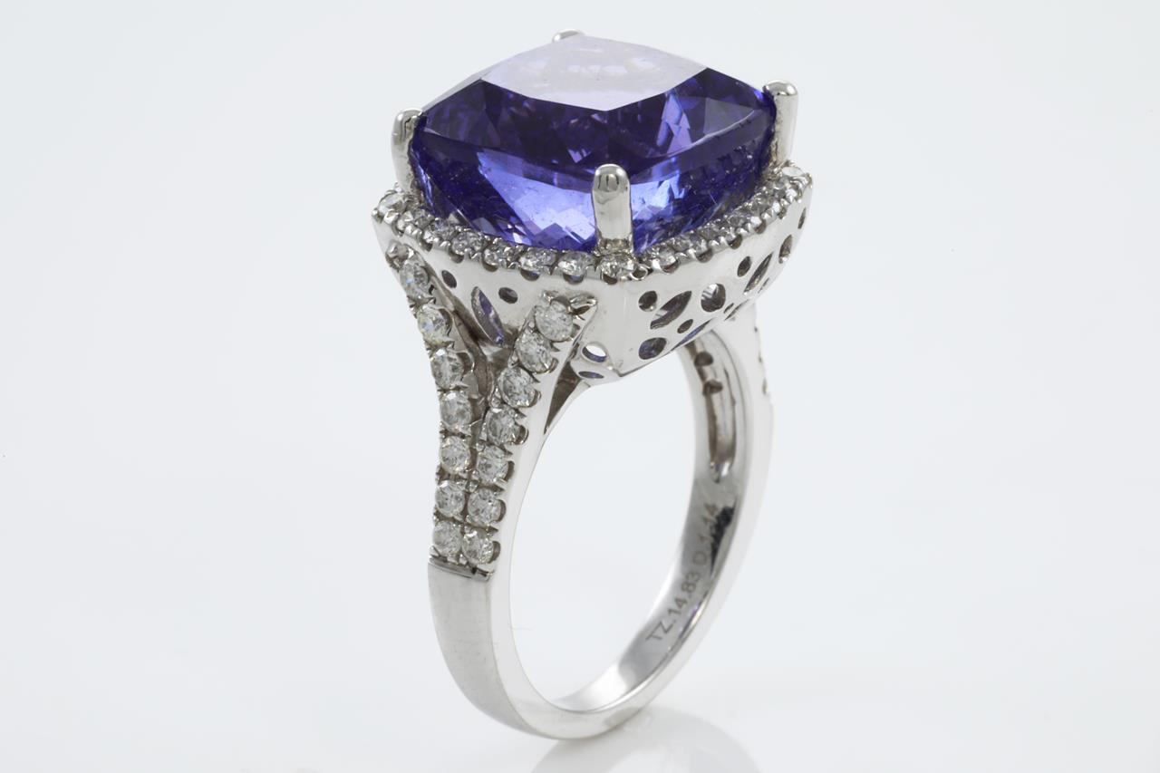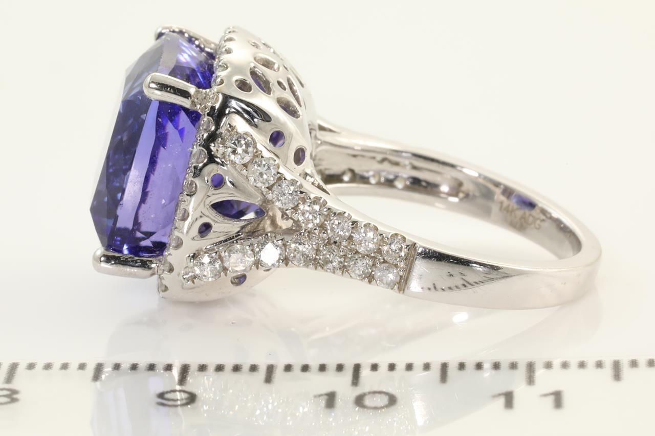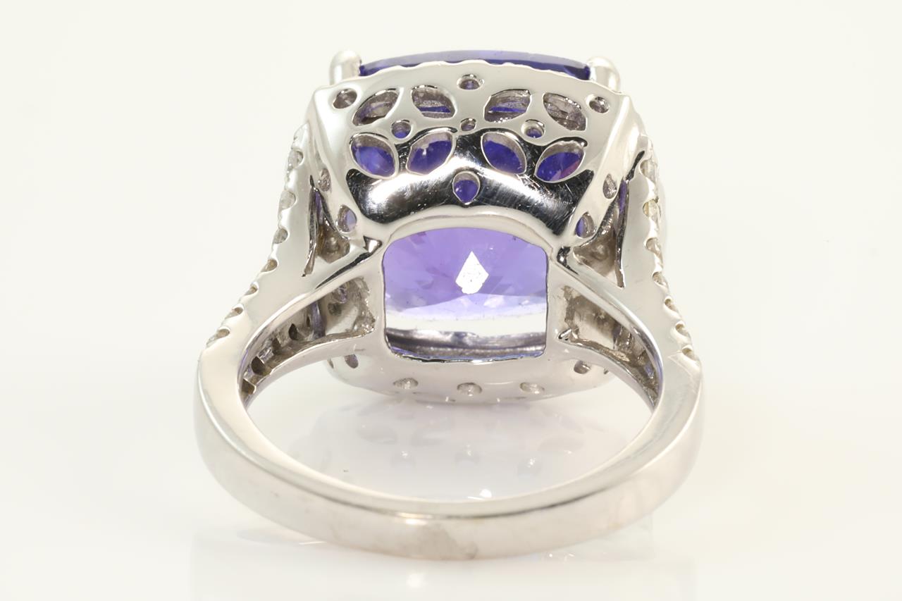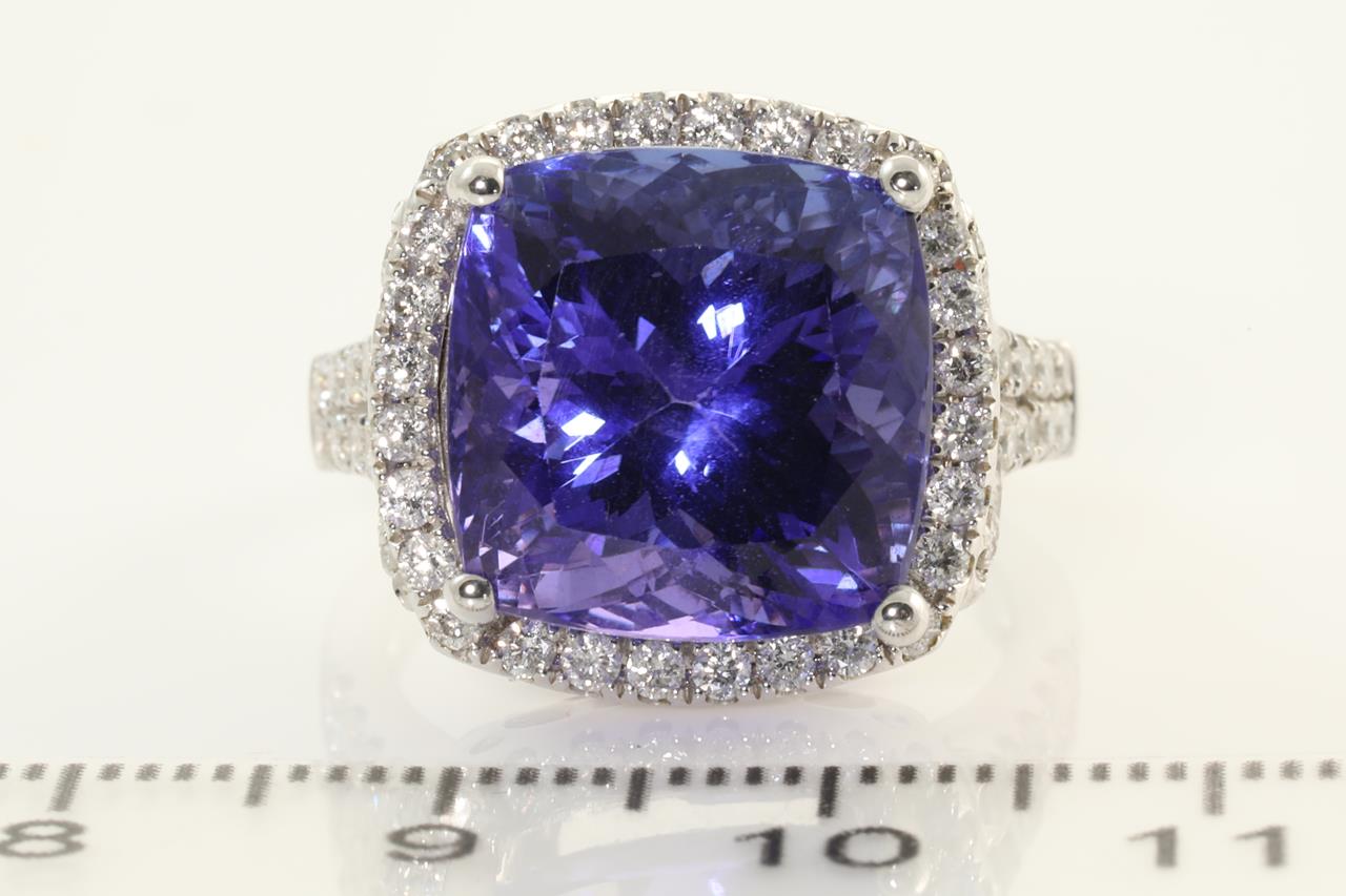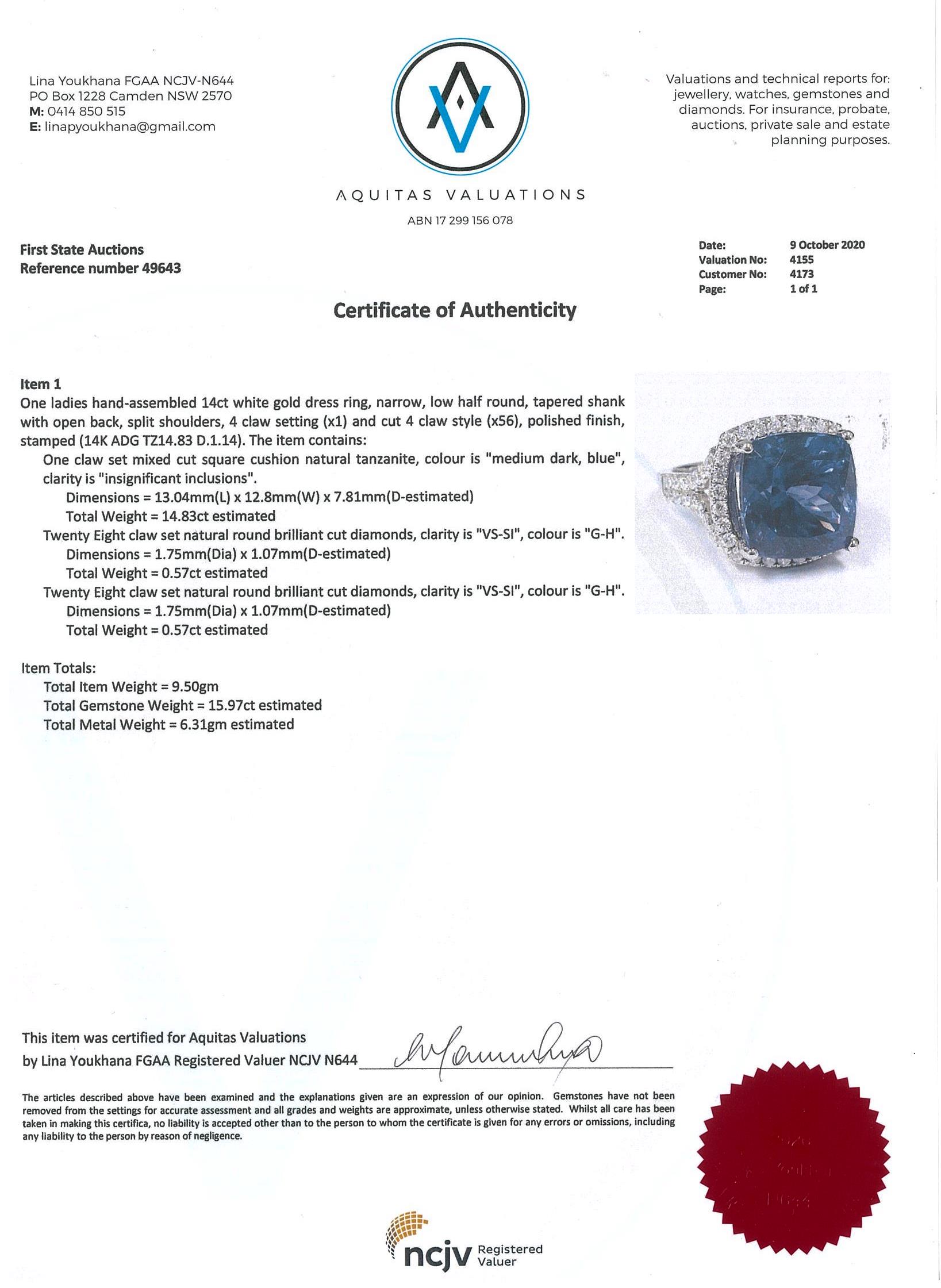Tanzanite and Diamond ring with cushion cut Tanzanite of 14.83ct and Diamonds totalling 1.14cts (Estimated grading: G-H VS-SI). 18ct white gold. Ring size N1/2 - ring size can be increased by 3 sizes, resizing down is not recommended. Weight: 9.5g with certificate #4155. (As New)