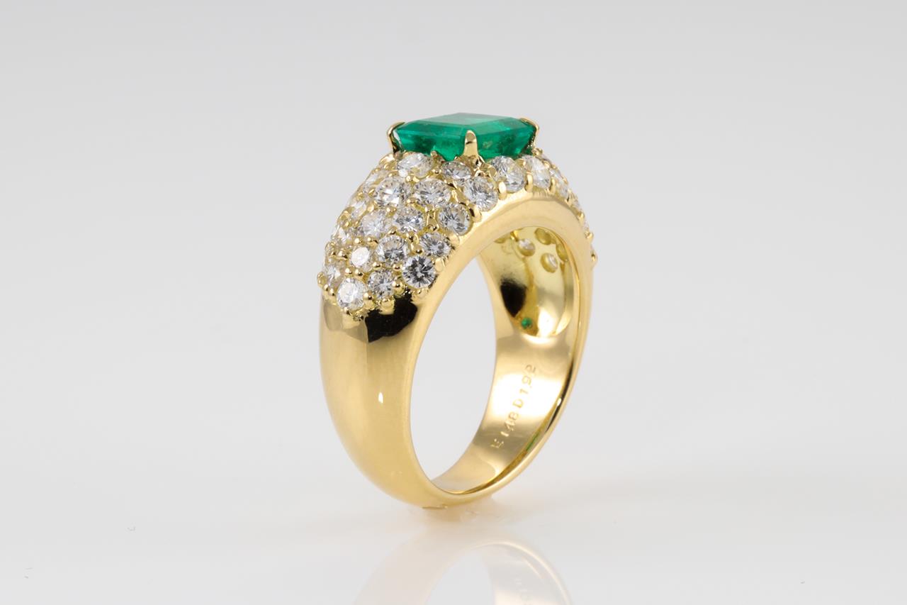 Emerald and Diamond ring with emerald cut Emerald of 1.48ct and Diamonds totalling 1.92cts (Estimated grading: H SI). 18ct yellow gold. Ring size: L. Weight: 9.3g. With Certificate #413790. (Pre-owned)