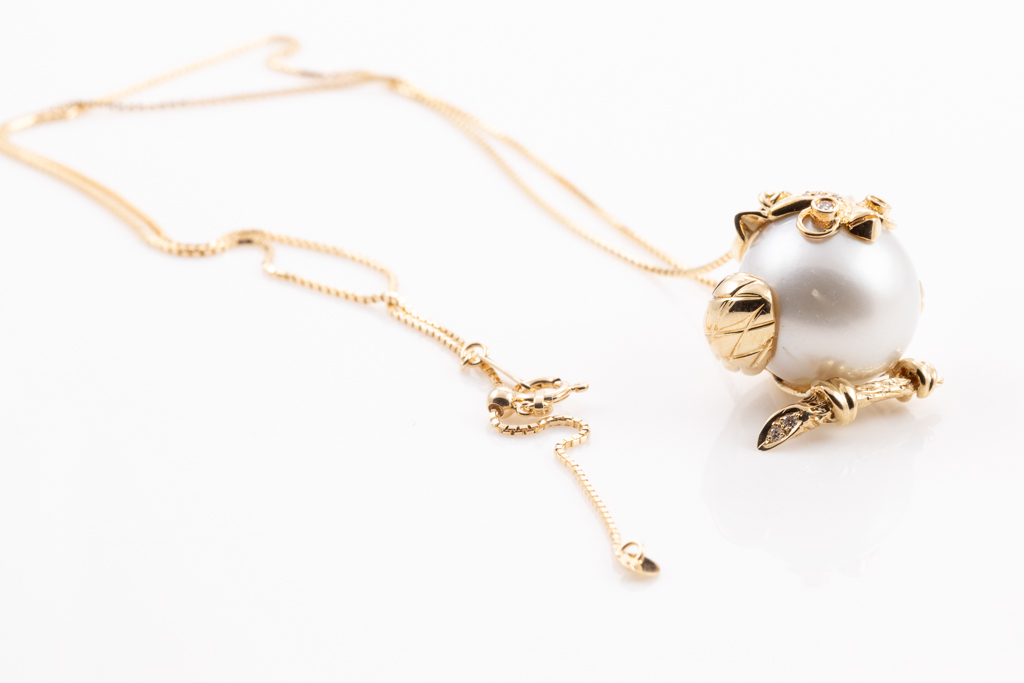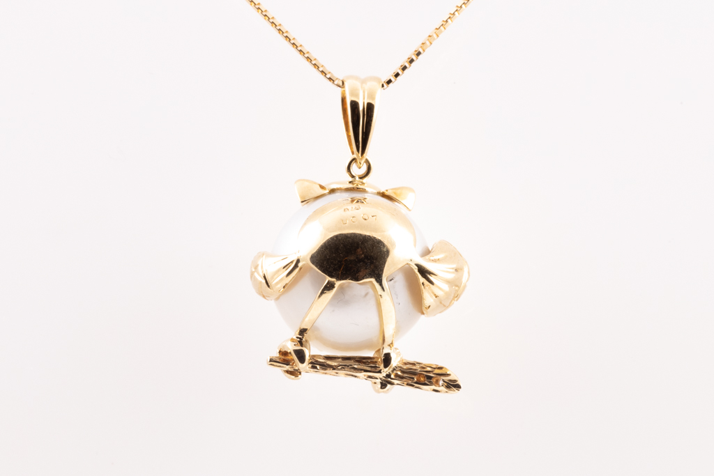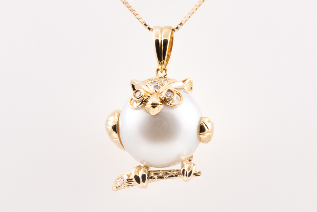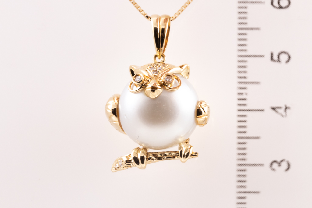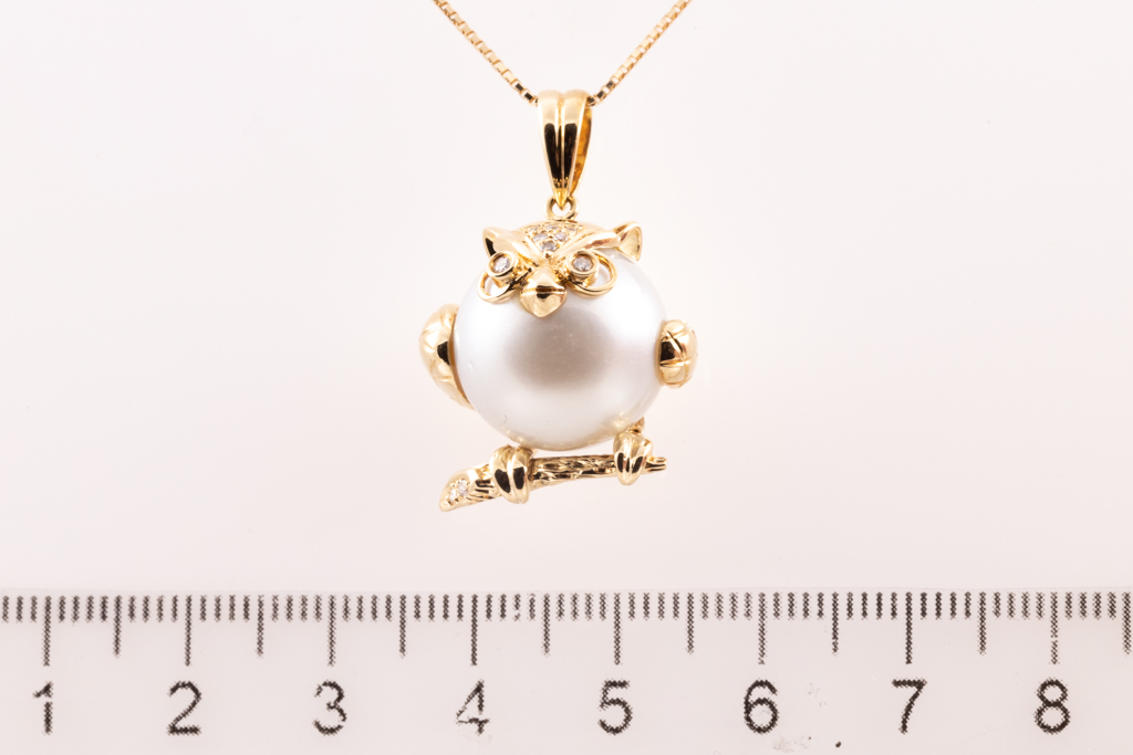 Pearl and Diamond owl design pendant with South Sea Pearl of approximately 14.8mm and round Diamonds totalling 0.07cts. 18ct yellow gold with 18ct yellow gold adjustable 44cm chain. Weight: 11.4g. (Pre-owned)