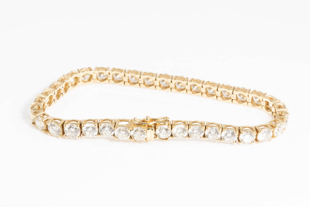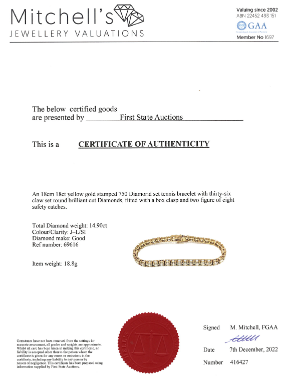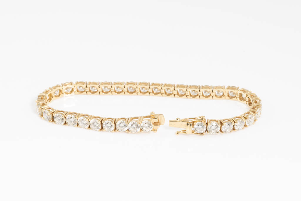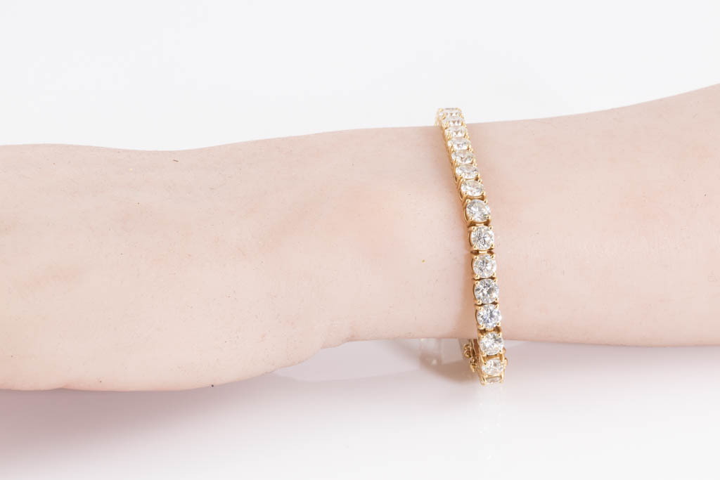 Diamond tennis bracelet with 36 round Diamonds totalling 14.90cts (Estimated grading: J-L SI). 18ct yellow gold. Length: 18cm. Weight: 18.8g. With certificate #416427. (As New)