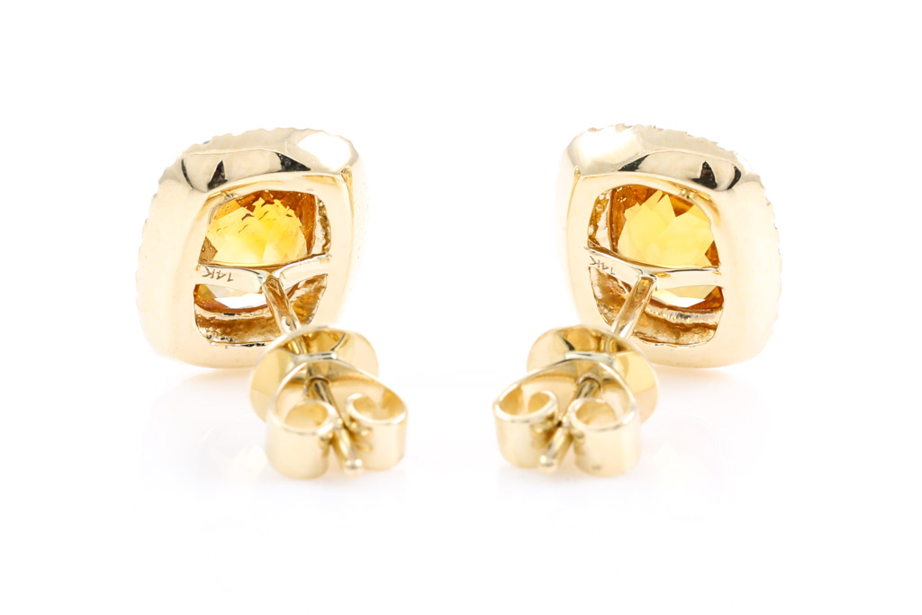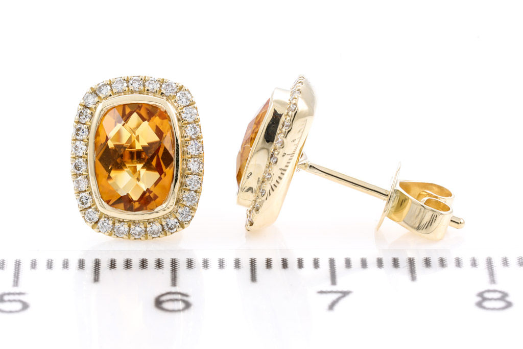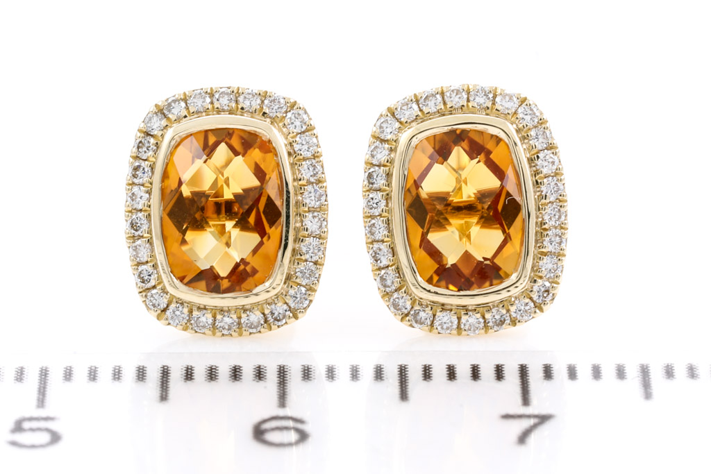 Citrine and Diamond earrings with cushion cut Citrines totalling 1.49cts and round Diamonds totalling 0.23cts. 14ct yellow gold. Weight: 2.4g. (New)