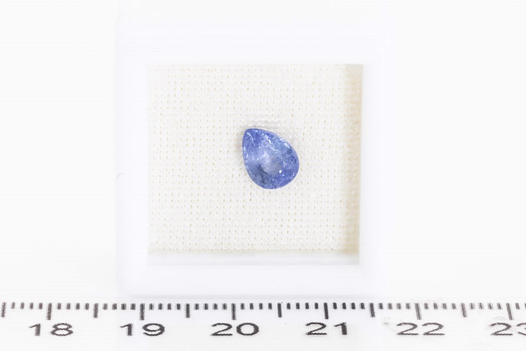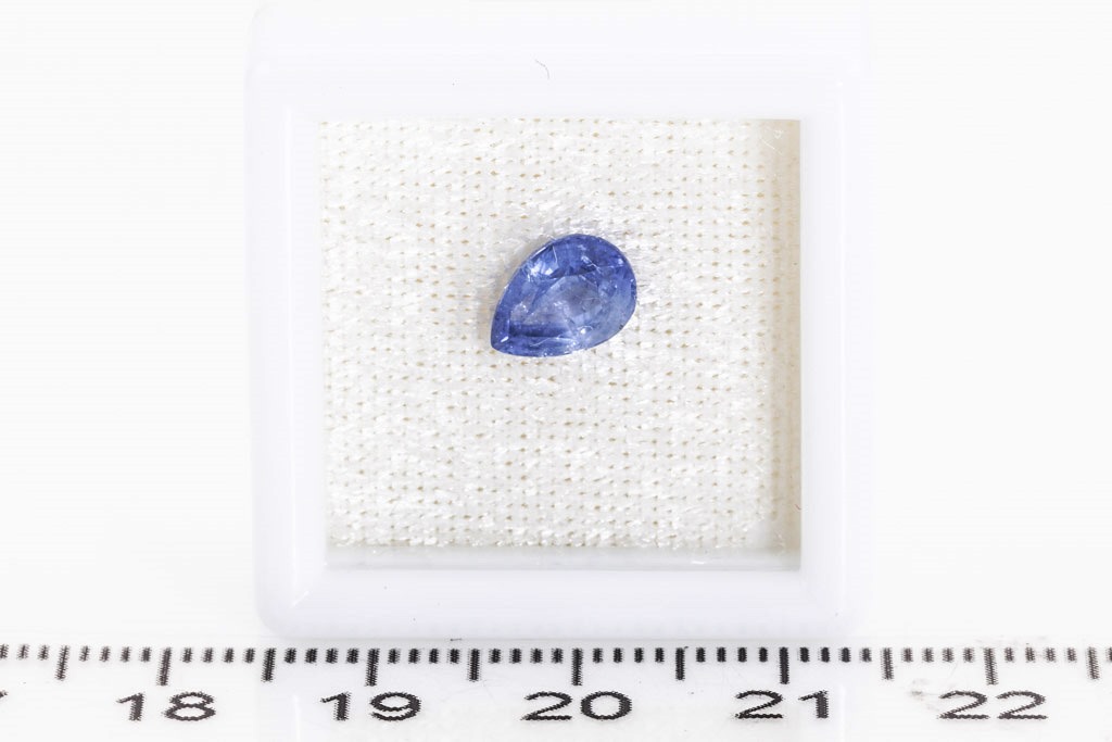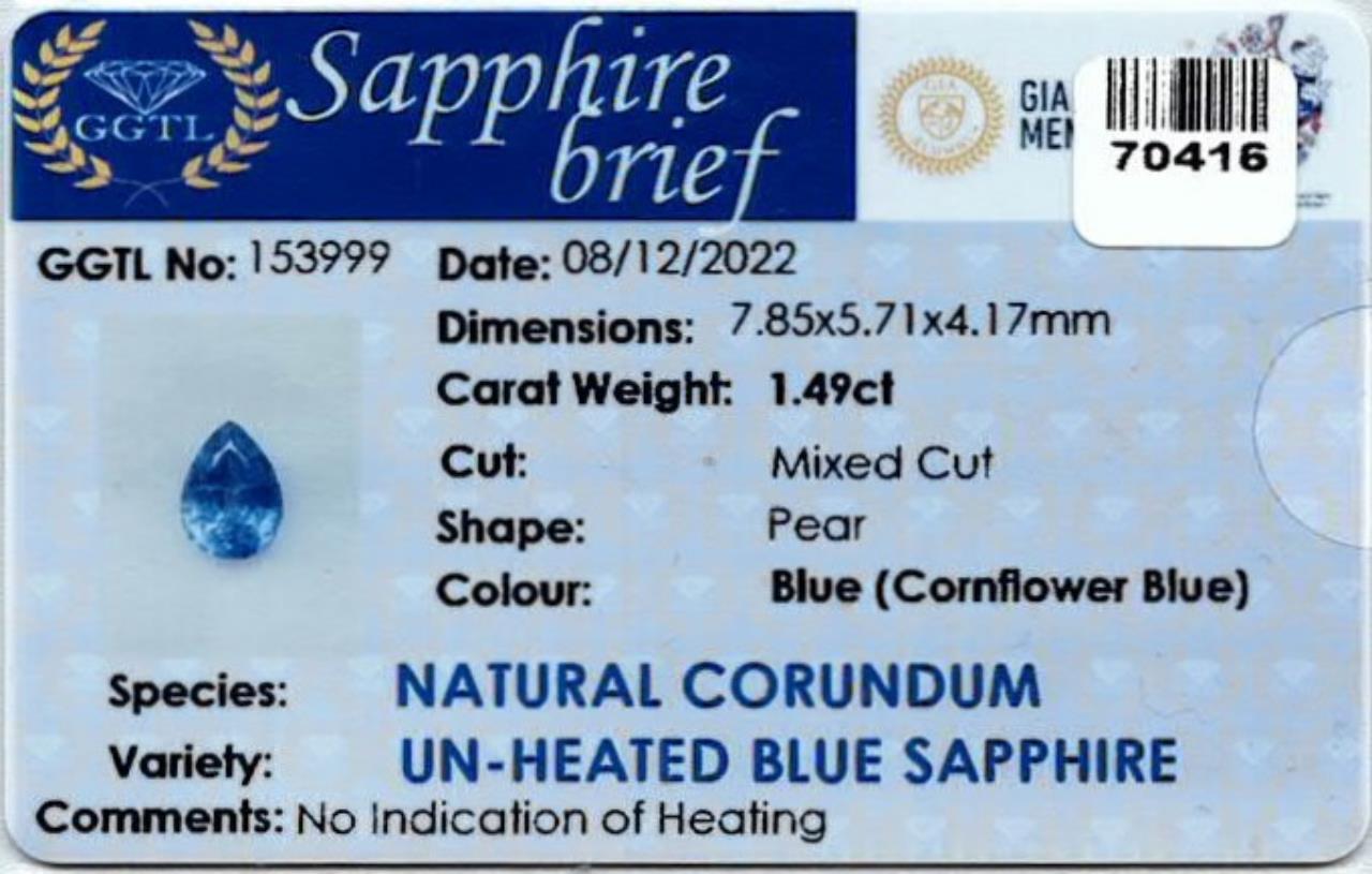 A loose pear shape un-heated Ceylon Cornflower blue Sapphire of 1.49ct. With Gem report #153999. (As New)