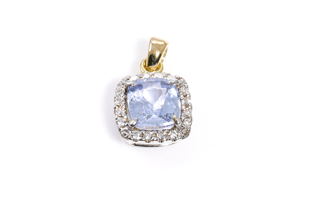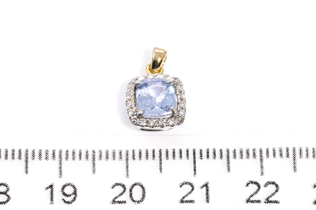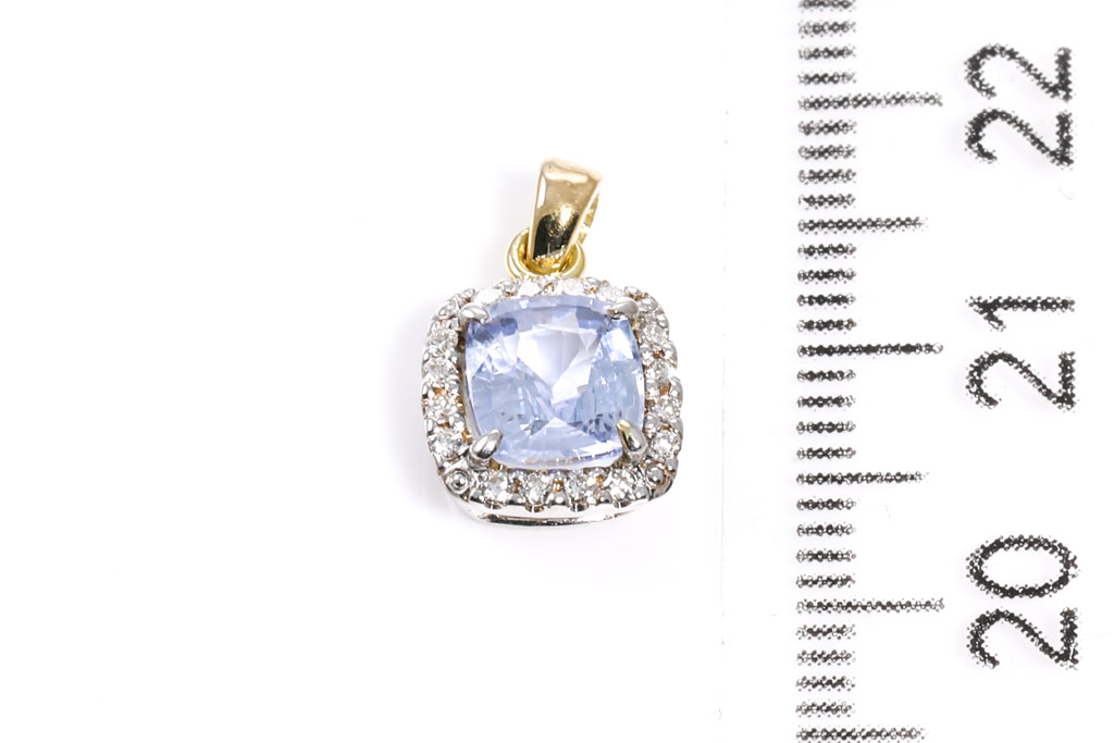 Sapphire and Diamond pendant with cushion cut unheated Ceylon light blue Sapphire of 1.49ct and round Diamonds totalling approximately 0.16cts. 18ct yellow and white gold. No chain provided. Weight 1.5g. With Gem report. (As New)