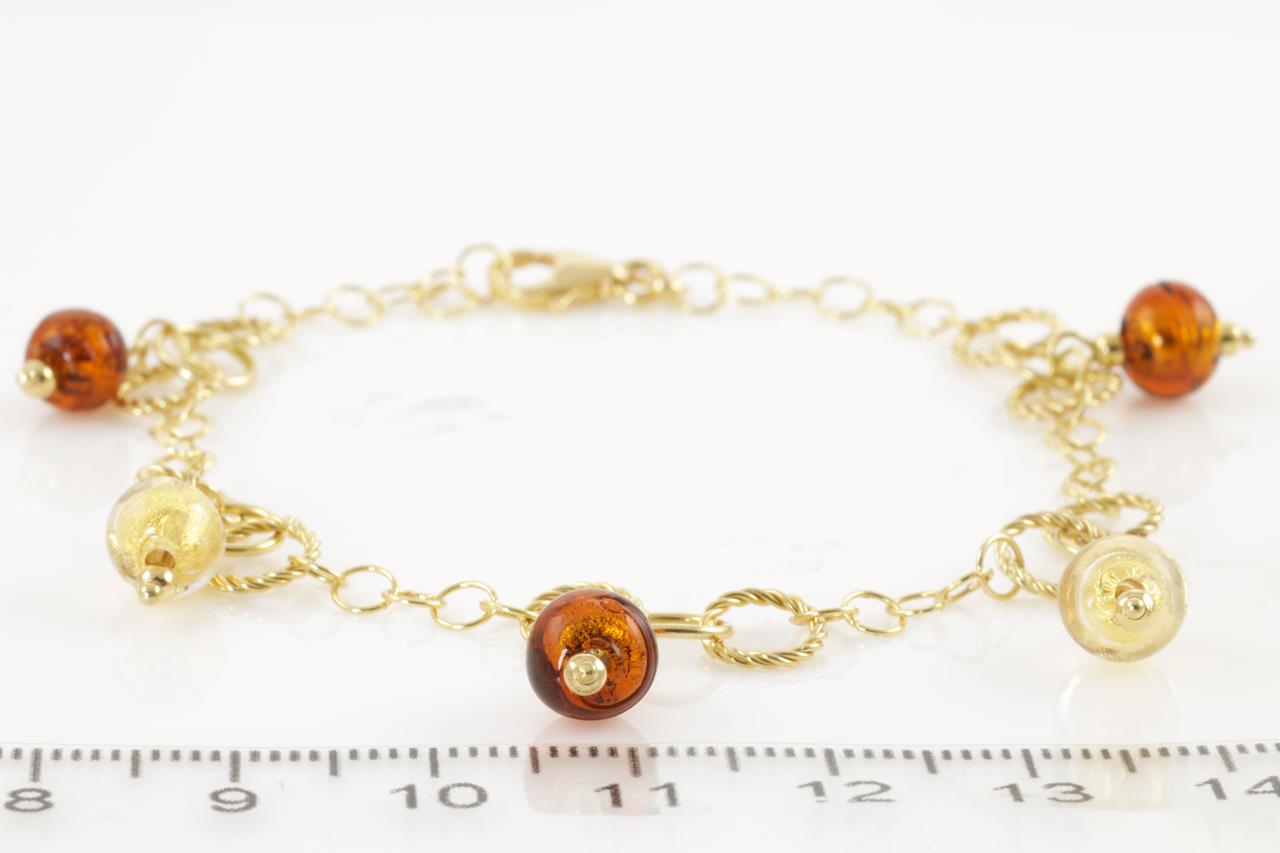 14ct yellow gold bracelet with five glass beads. Length 18.5cm. Weight 5.2g. (Pre-owned)