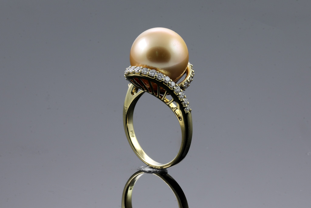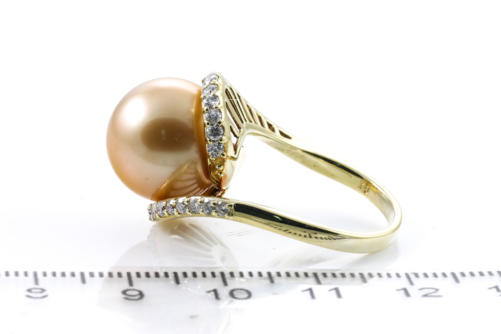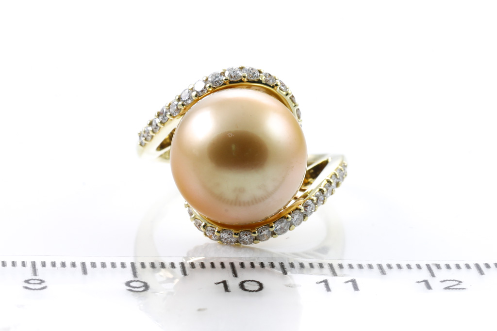 Pearl and Diamond ring with Golden South Sea Pearl of 14.0mm and round Diamonds totalling 0.70cts (Estimated grading: H SI-P1). 18ct yellow gold. Ring size Q - ring resizing is not recommended. Weight: 10.1g (Pre-owned)