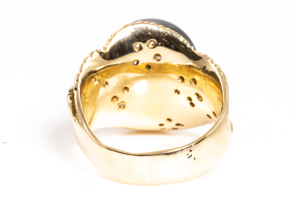Pearl and Diamond ring with Tahitian Pearl of 14mm and round Diamonds totalling 0.21cts. 18ct yellow gold. Ring size P. Weight: 15.9g. (Pre-owned)