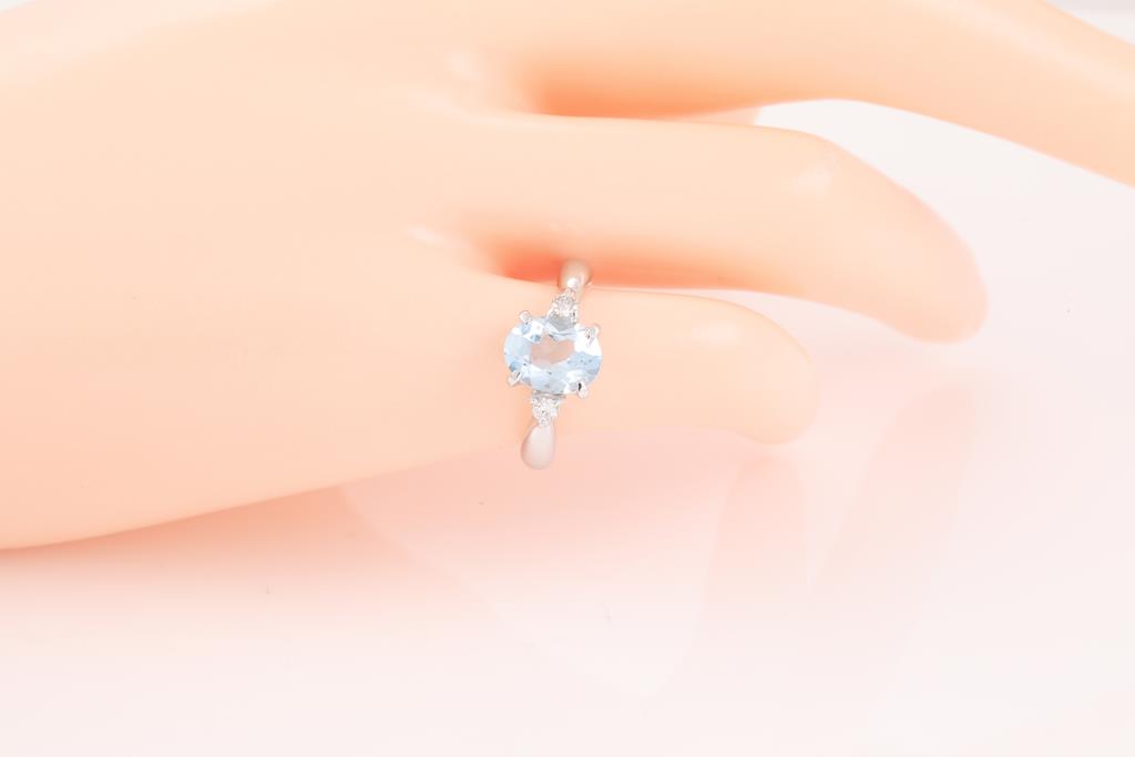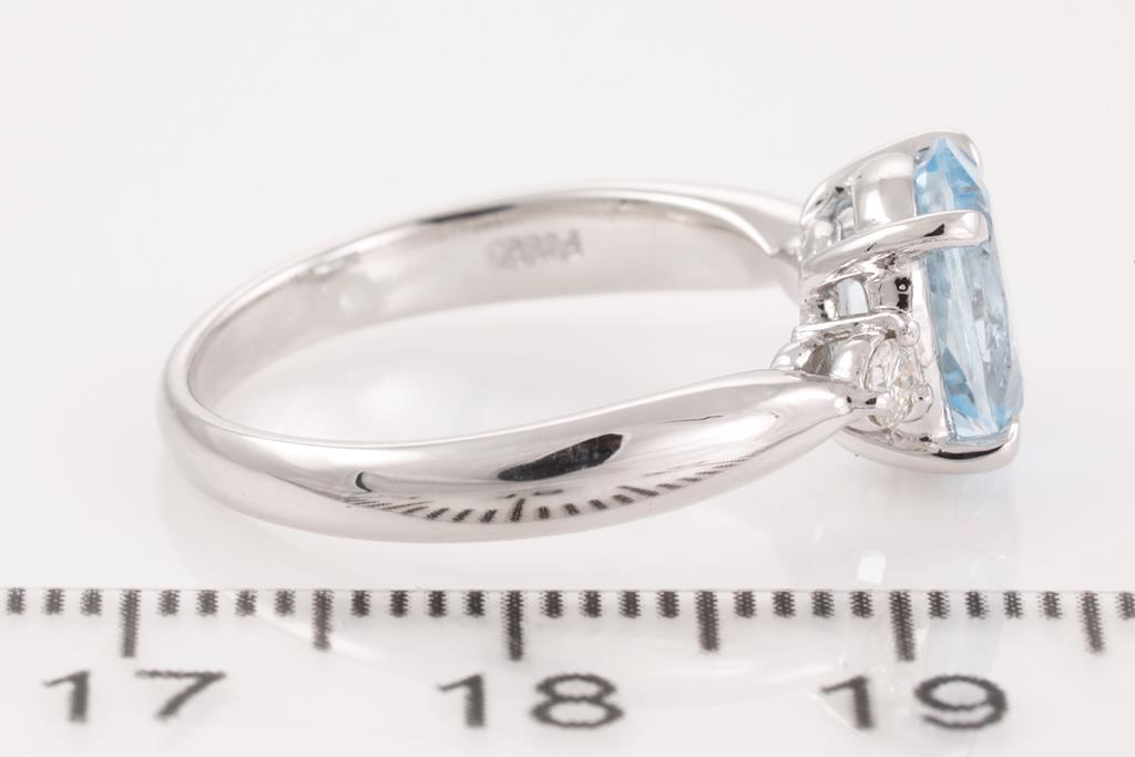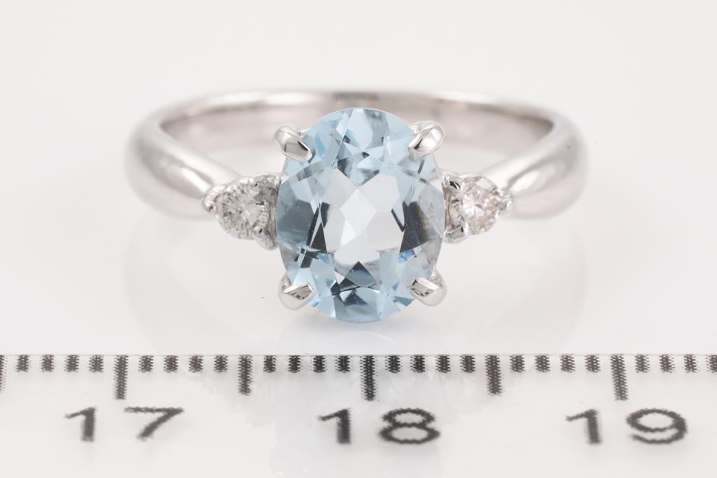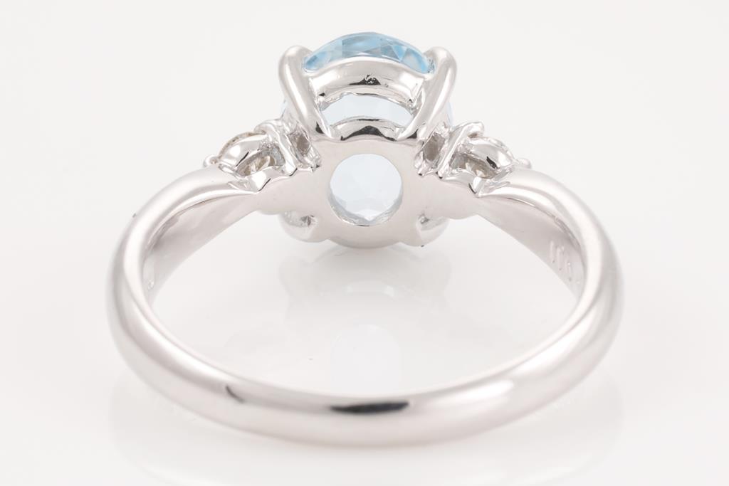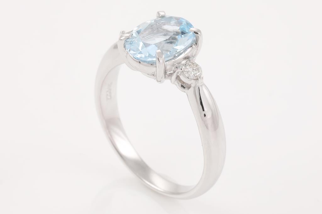 Aquamarine and Diamond ring with an oval Aquamarine of 1.50ct and Diamonds totalling 0.11cts. Platinum. Ring size L. Weight: 5.5g. (Pre-owned)