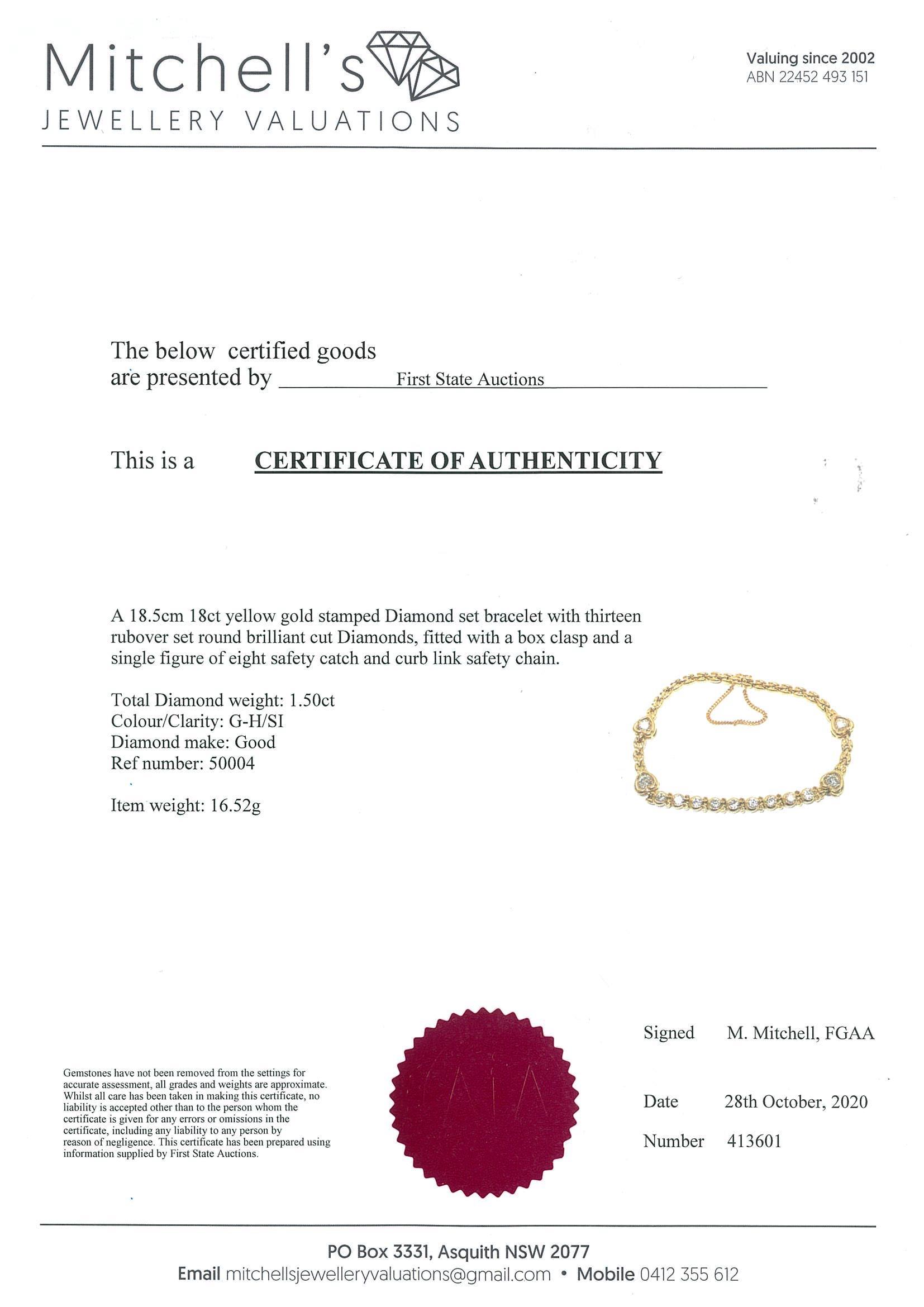 Diamond bracelet with Diamonds totalling 1.50cts (Estimated grading: G-H SI). 18ct yellow gold. Length: 18.5cm. With certificate #413601. Weight: 16.52g (Pre-owned)