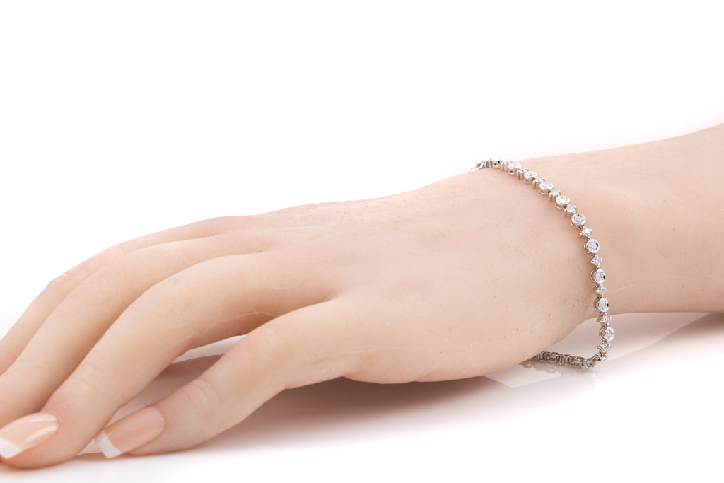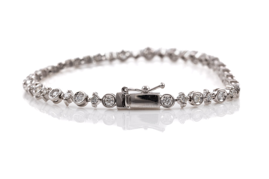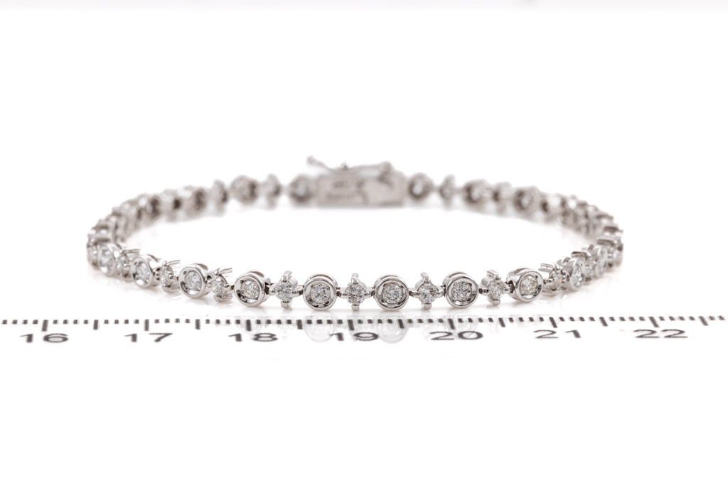 Diamond bracelet with 47 round Diamonds totalling 1.50cts (Estimated grading: H SI). 18ct white gold. Length: 18.0cm. Weight: 8.2g. (Pre-owned)