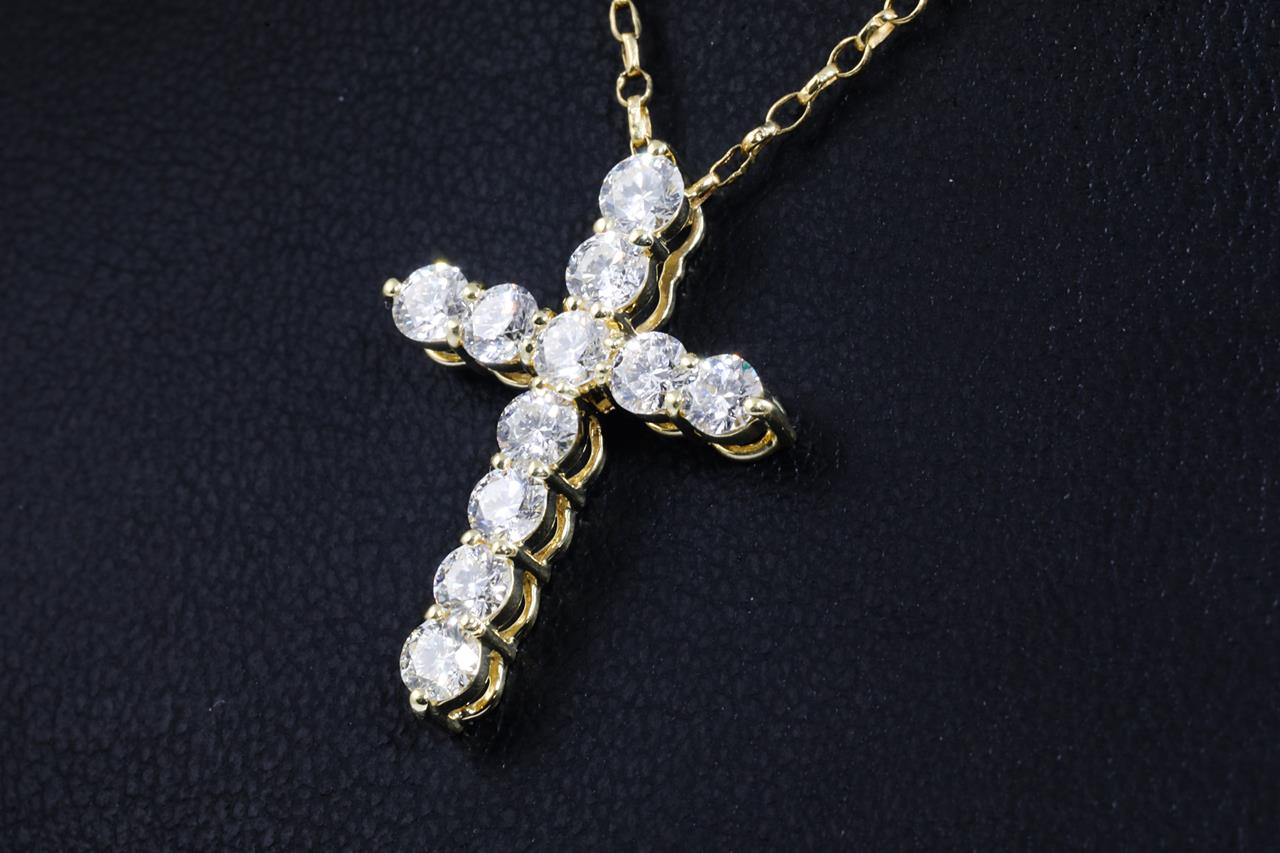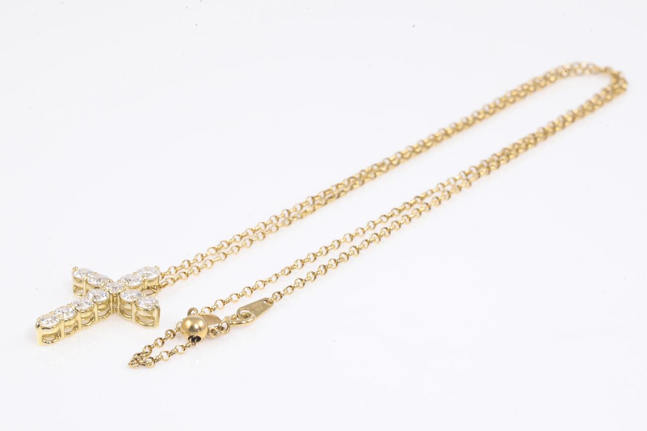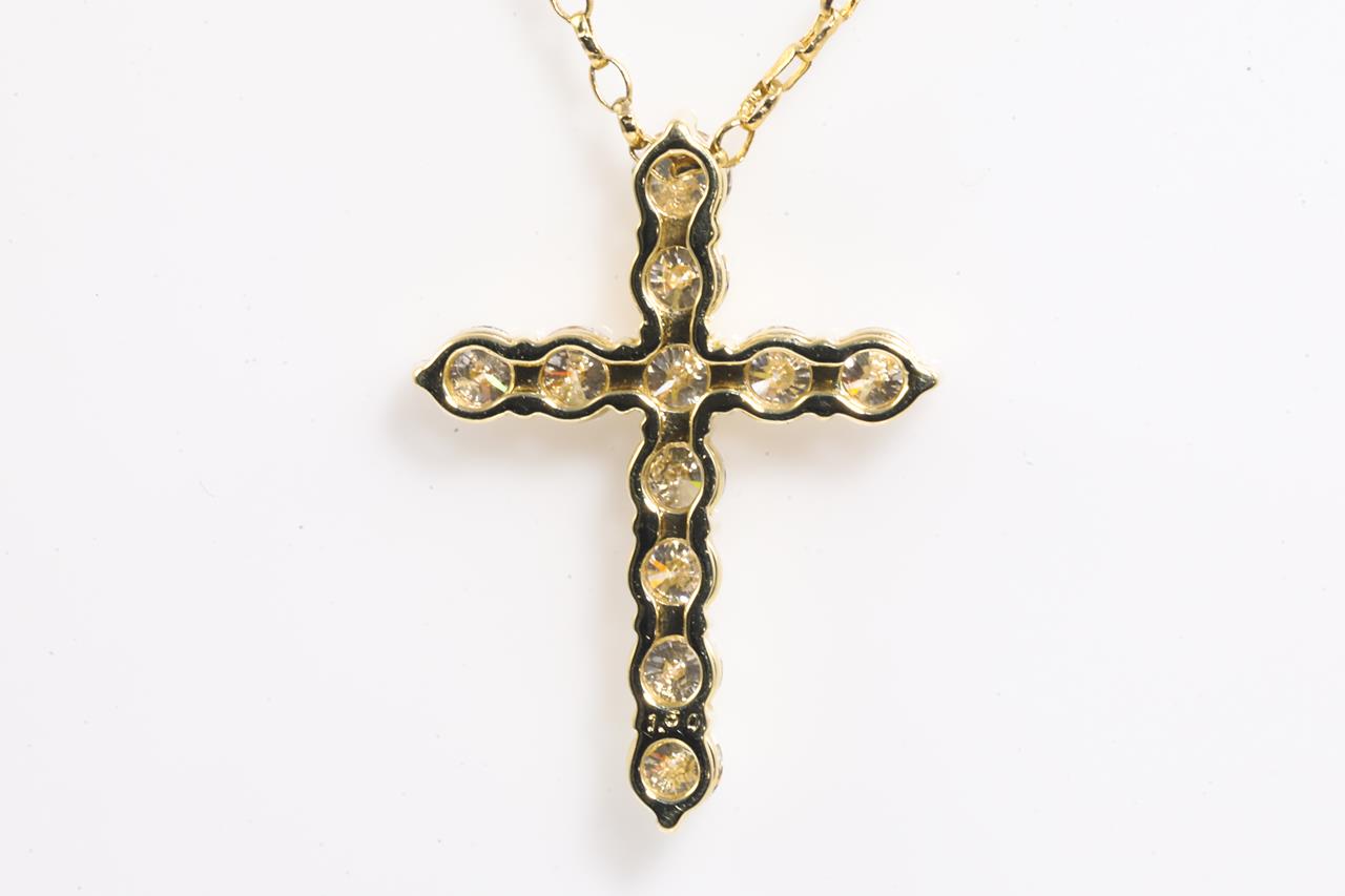 Diamond cross pendant with round Diamonds totalling 1.50cts (Estimated grading: H SI). 18ct yellow gold with adjustable 48cm chain. Weight: 3.7g (Pre-owned)