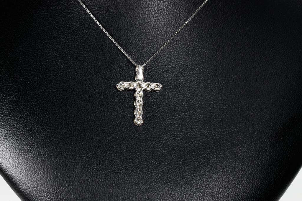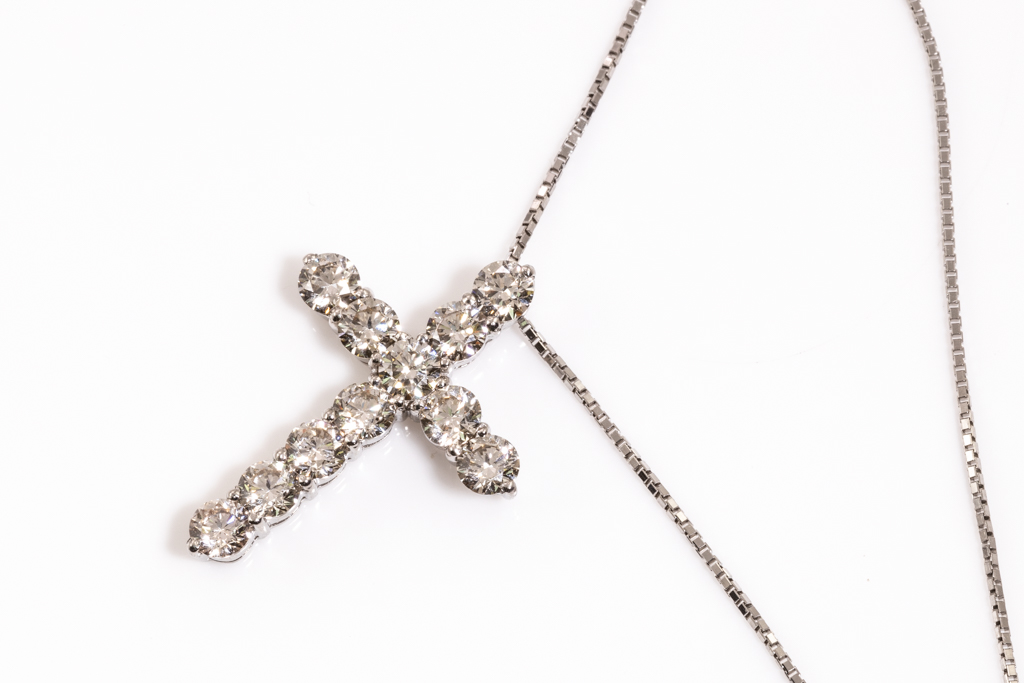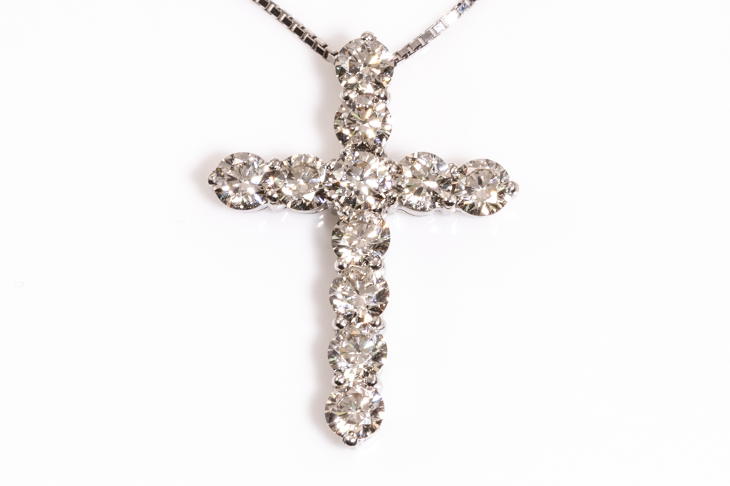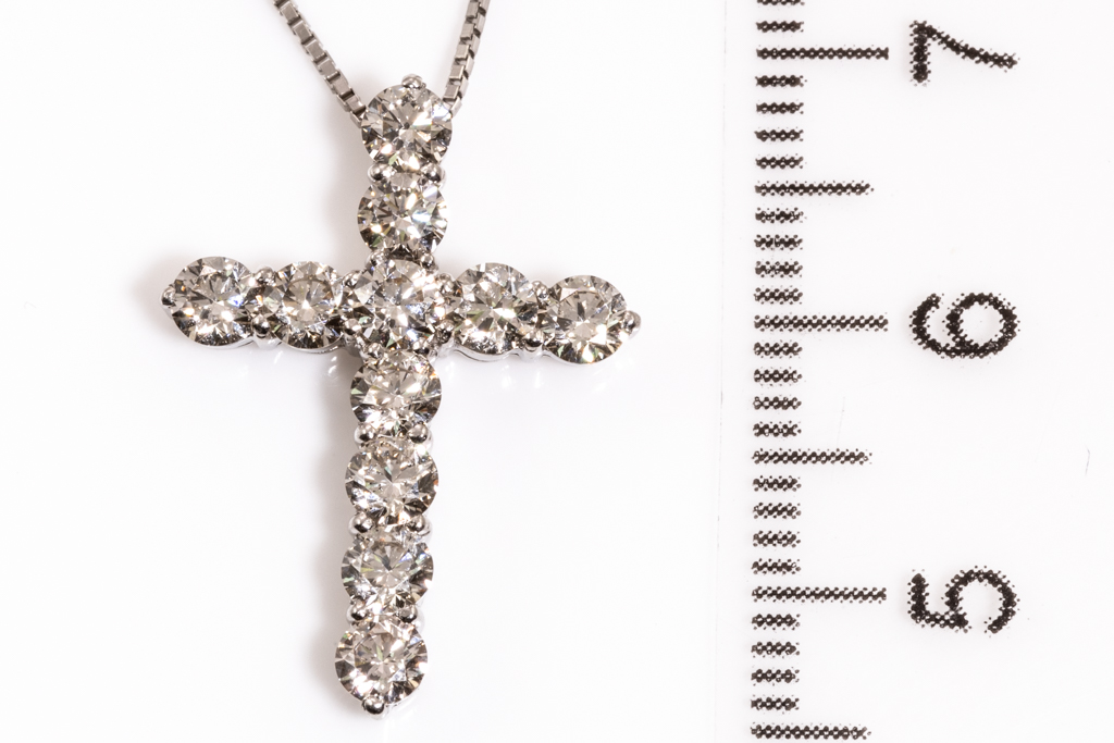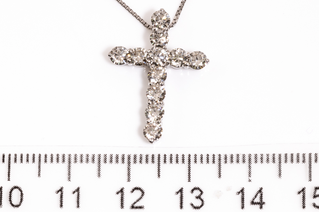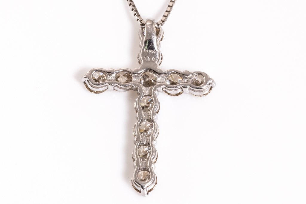 Diamond cross pendant with round Diamonds totalling 1.50cts (Estimated grading: J-K SI). Platinum with platinum adjustable chain. Length: 44cm. Weight: 4.1g. (Pre-owned)