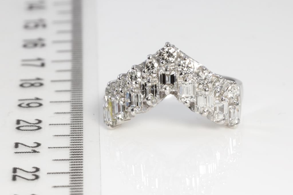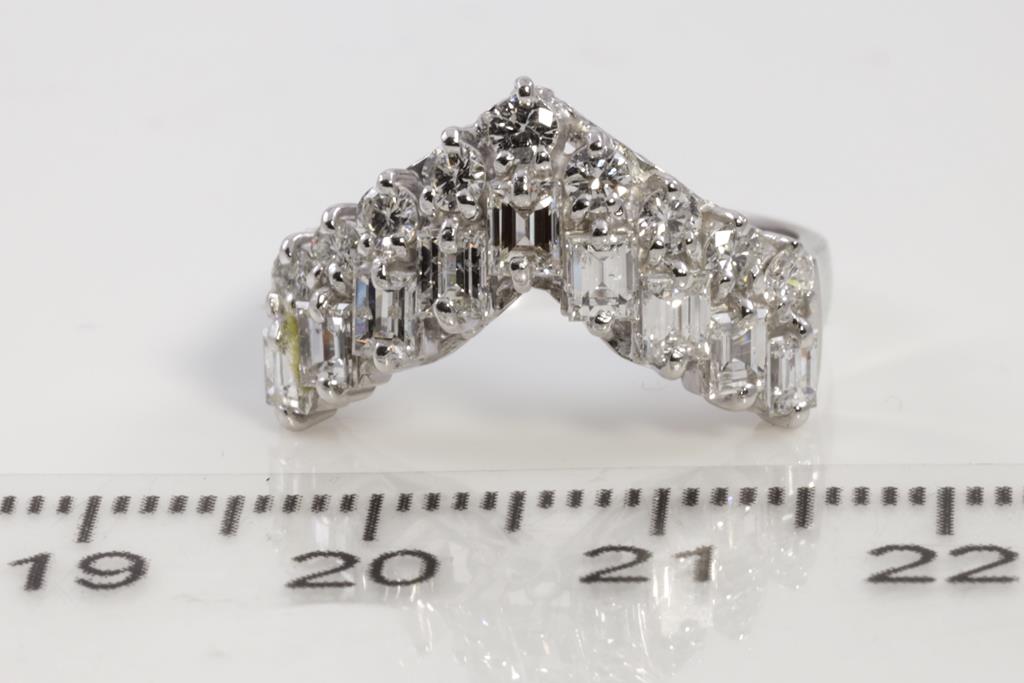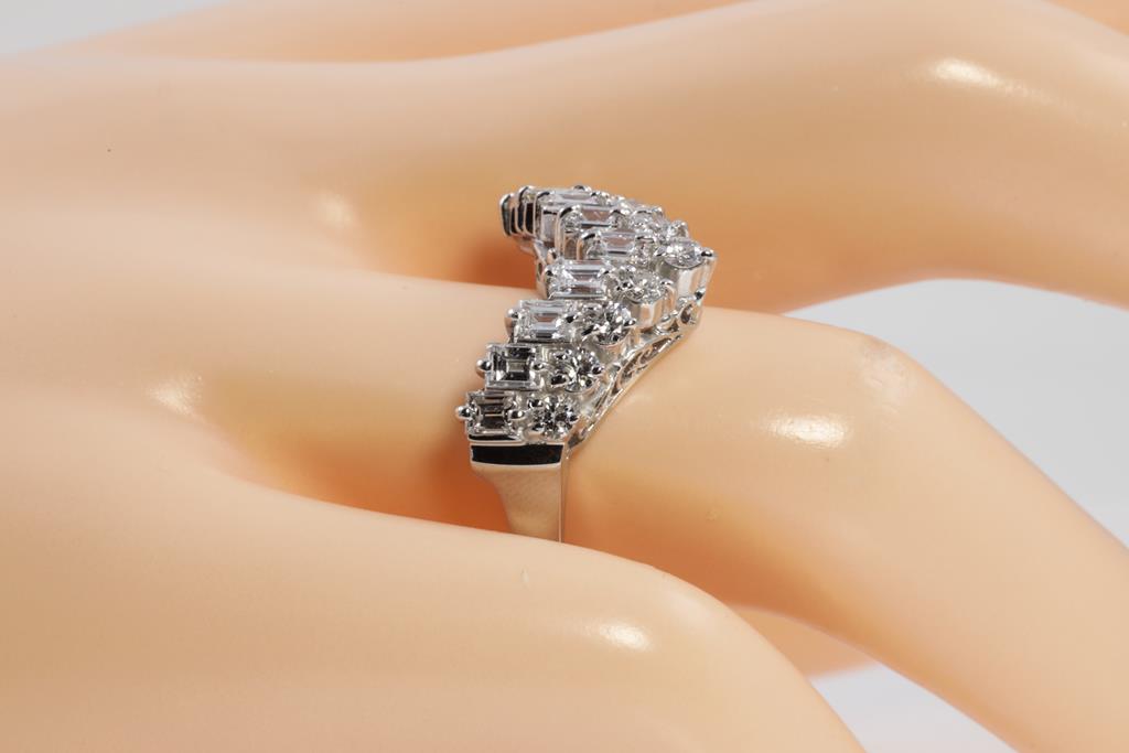 Diamond dress ring with round & baguette cut Diamonds totalling 1.50cts (Estimated grading: G-H SI). Platinum. Ring size: N. Weight: 7.9g. (Pre-owned)