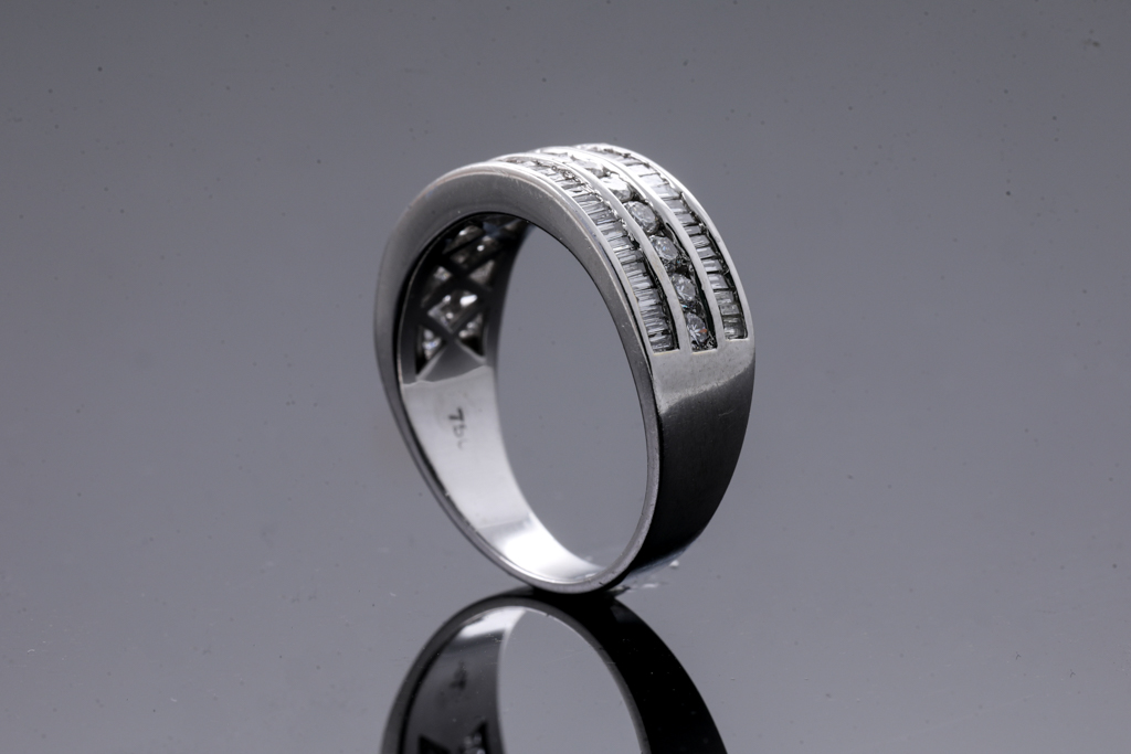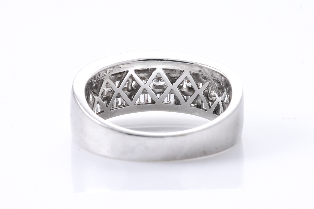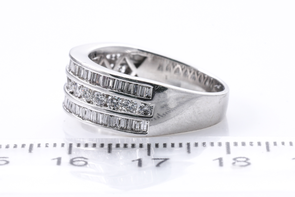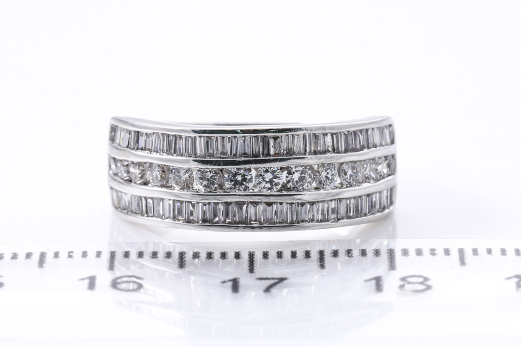 Diamond dress ring with round & baguette cut Diamonds totalling approximately 1.50cts (Estimated grading H-I SI-P1). 18ct white gold. Ring size O - ring resize is not recommended. Weight 5.8g (Pre-owned)