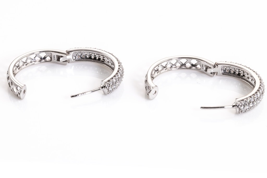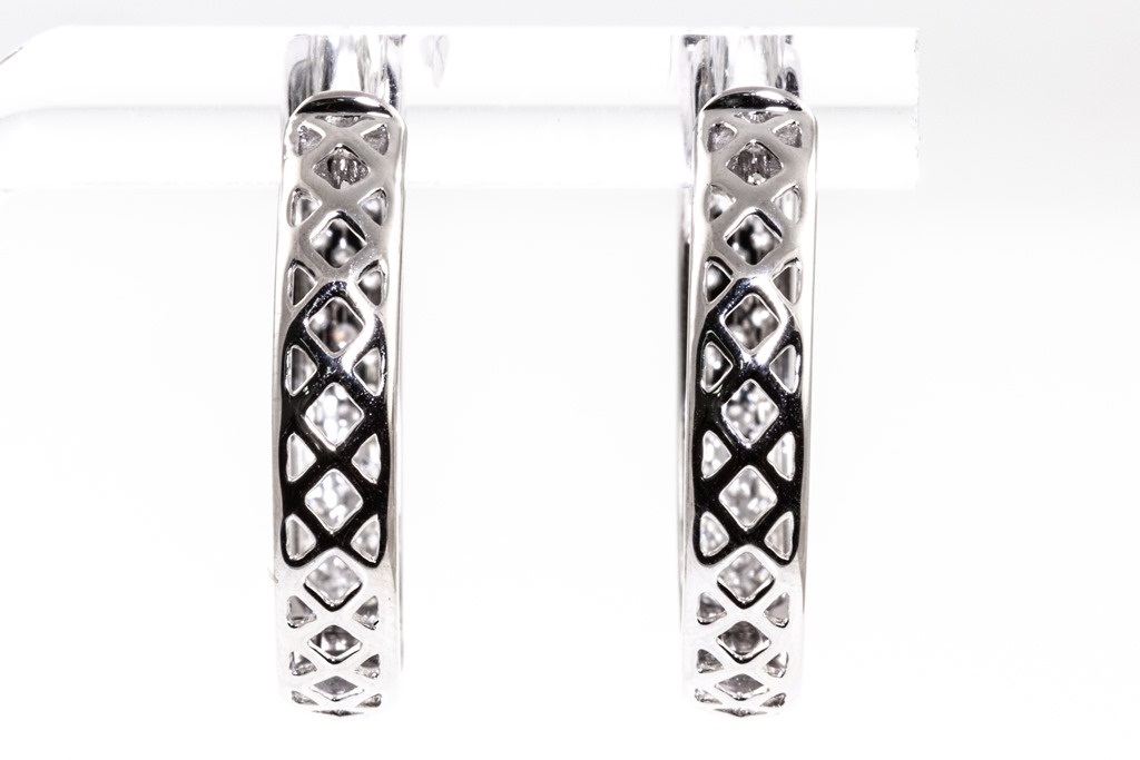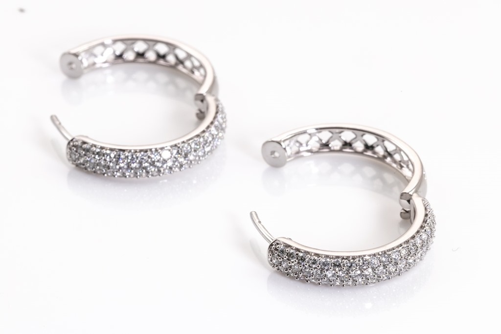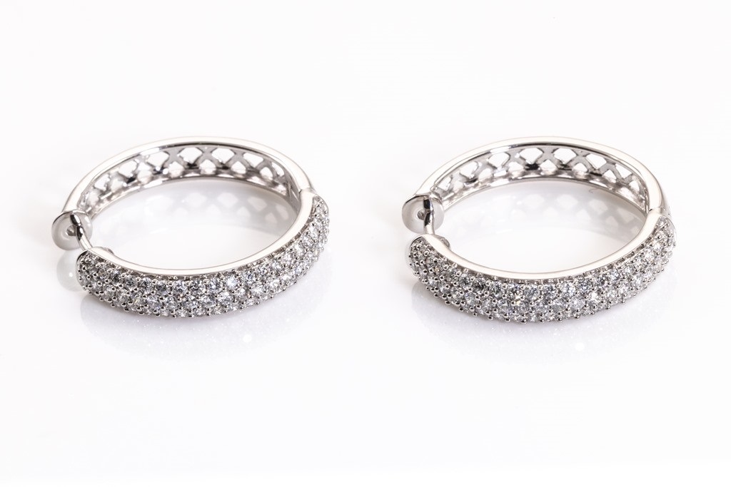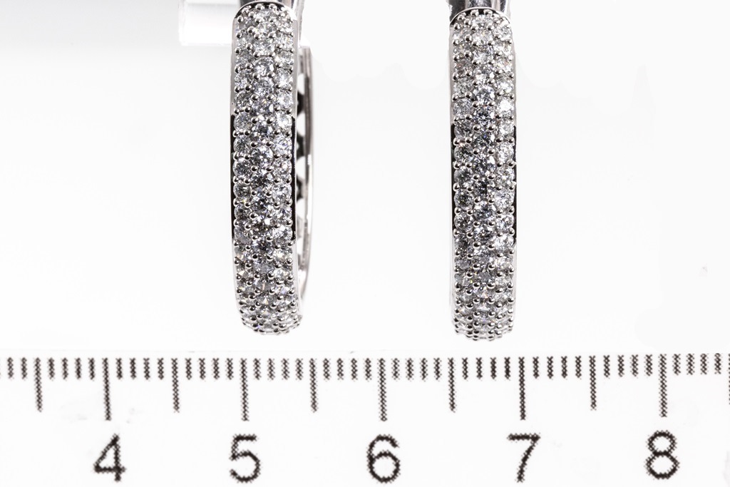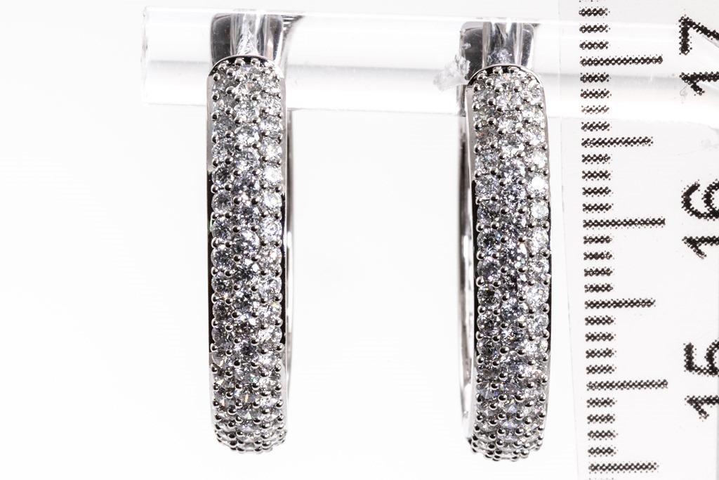 Diamond hoop earrings with round Diamonds totalling 1.50cts (Estimated grading: H SI). 14ct white gold. Weight: 7.3g. (New)