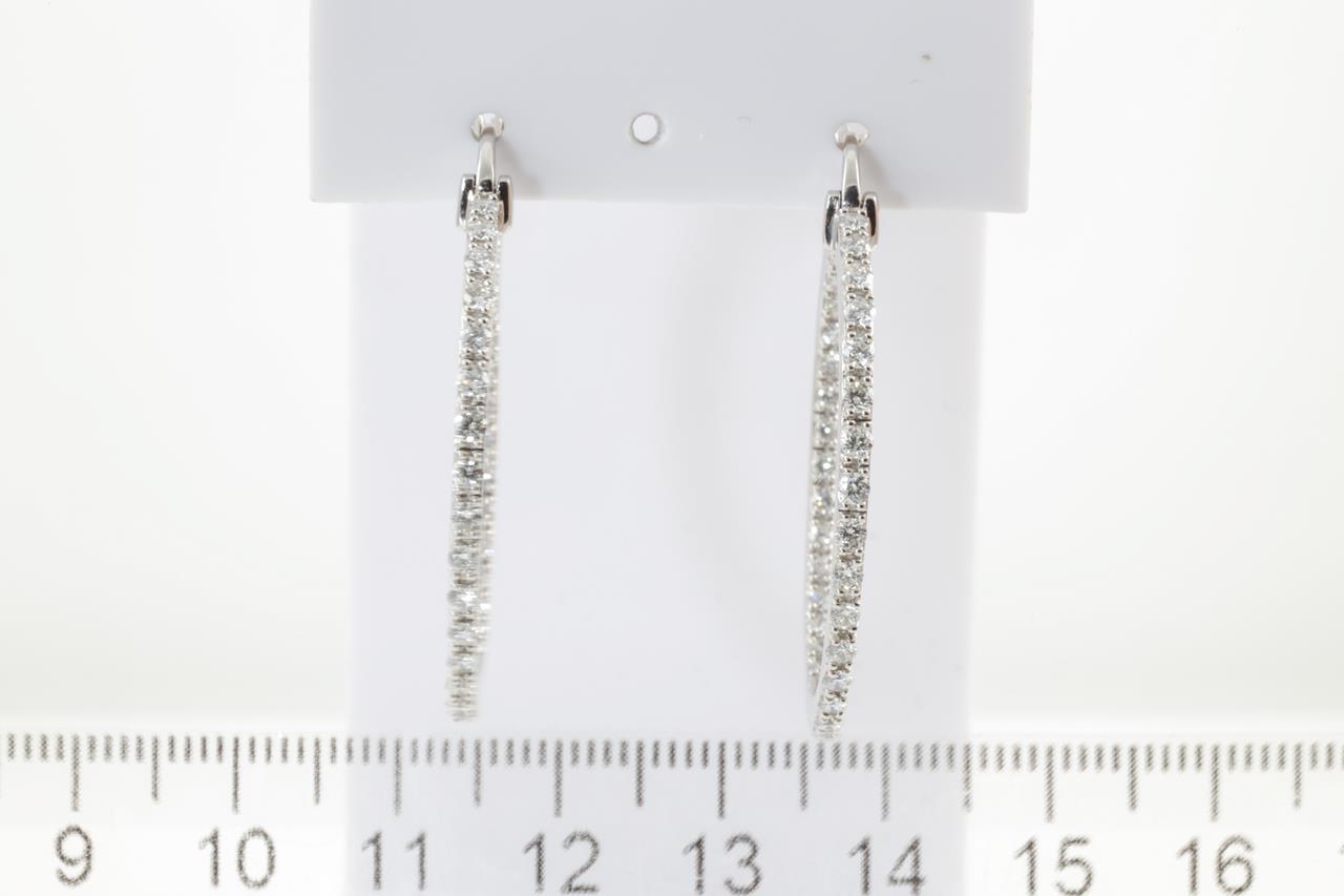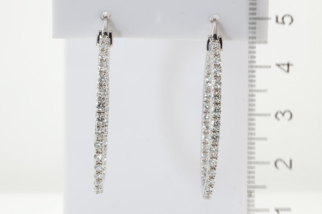 Diamond hoop earrings with round Diamonds totalling 1.50cts (Estimated grading: H SI). Back of the hoop has the diamonds set inside the hoop. 14ct White gold. Weight: 11.1g (New)
