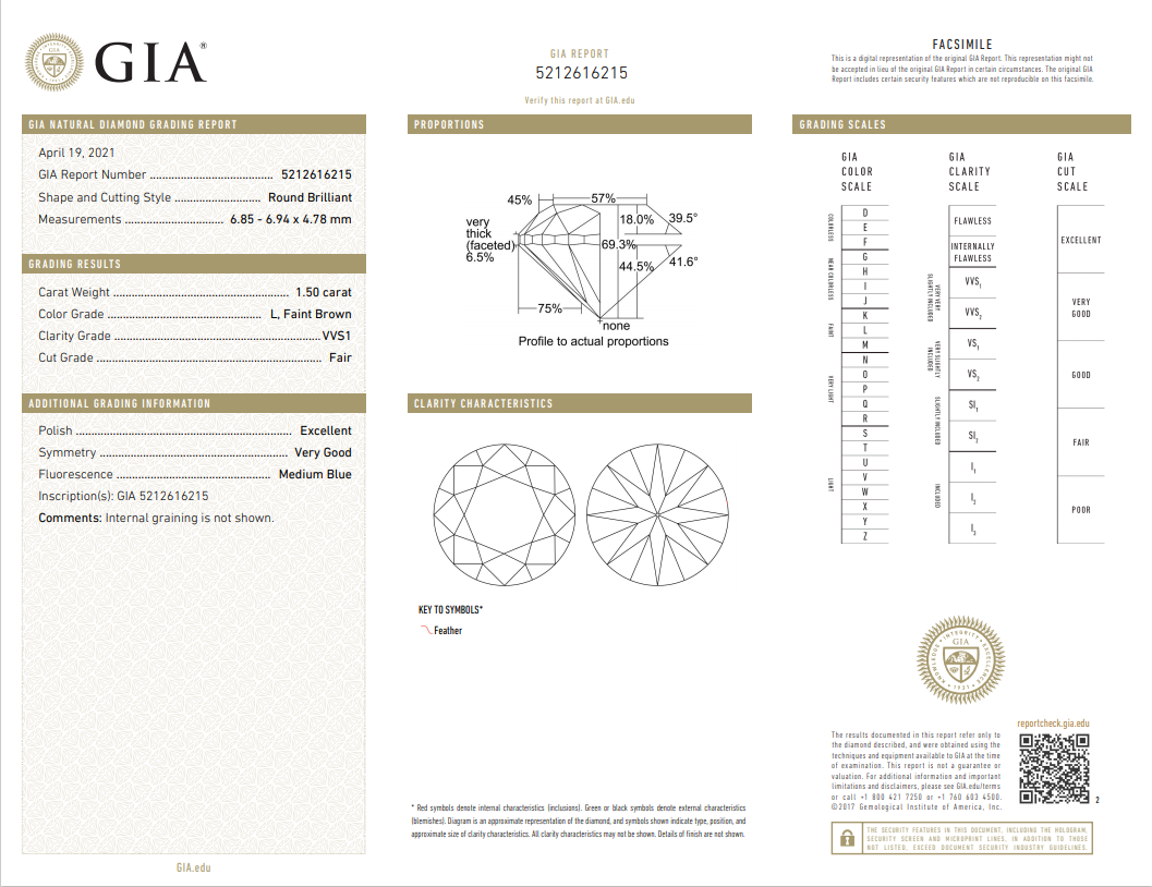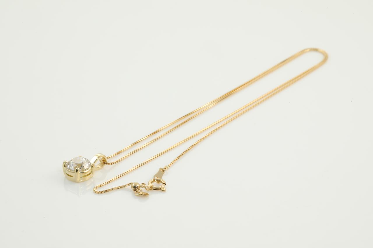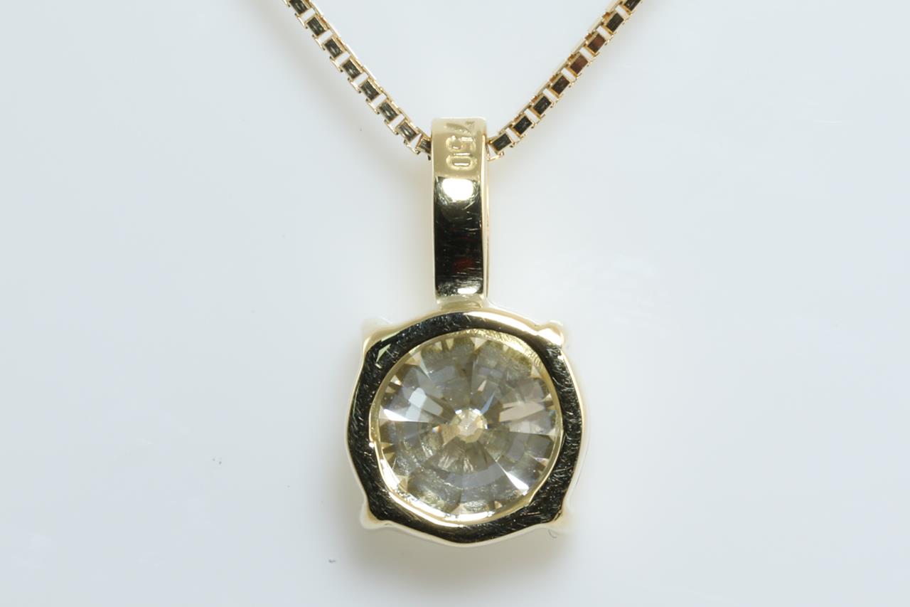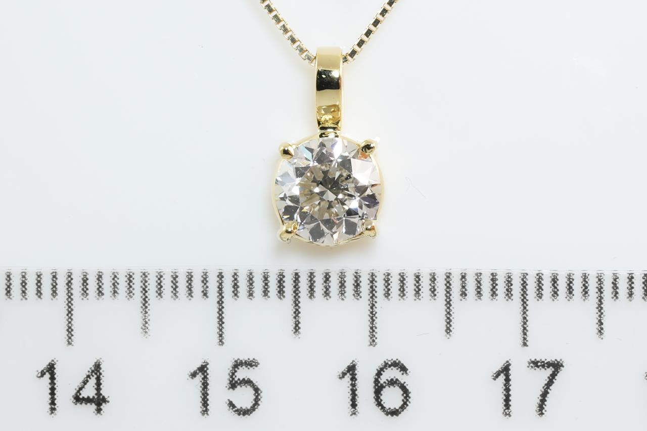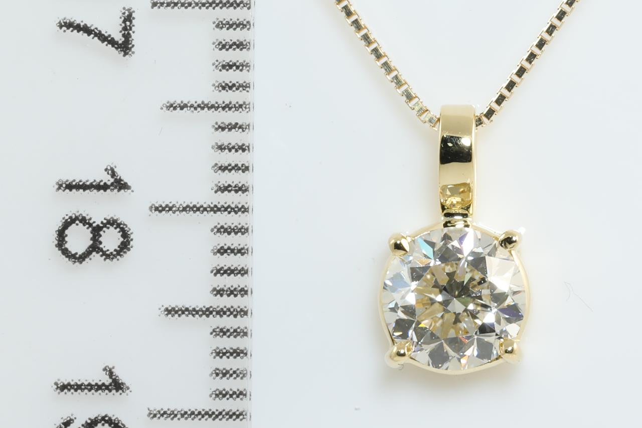 Diamond Solitaire pendant with Round Brilliant cut Diamond of 1.50ct (with GIA report graded as L VVS1 #5212616215) set in 18ct yellow gold with 45cm ajustable chain. Weight: 3.4g (New)
