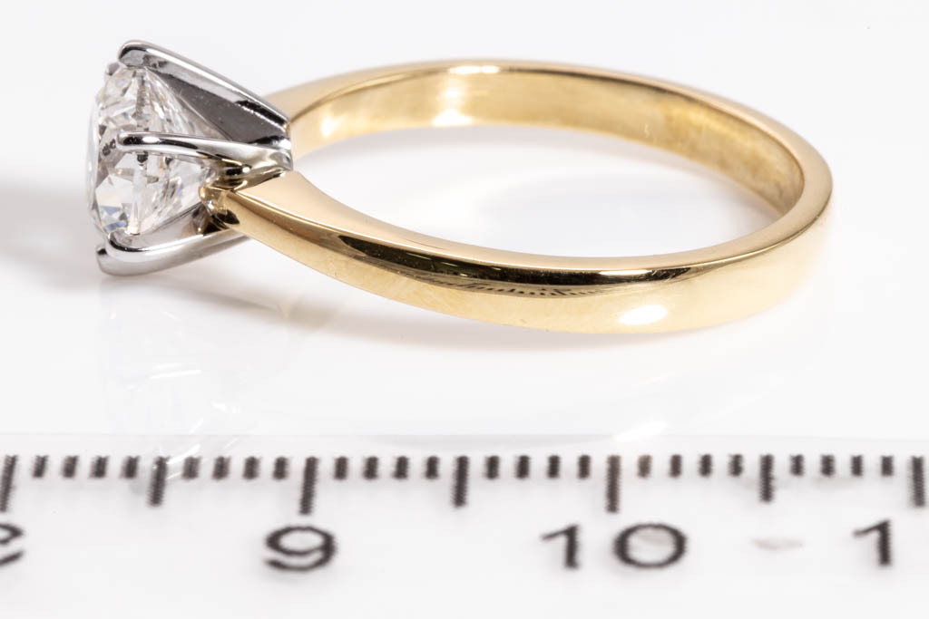 Diamond Solitaire Ring with round brilliant cut Diamond of 1.50ct (with GIA report graded as G SI2 #2448841410). 18ct yellow and white gold. Ring size O3/4. Weight 4.4g (New)