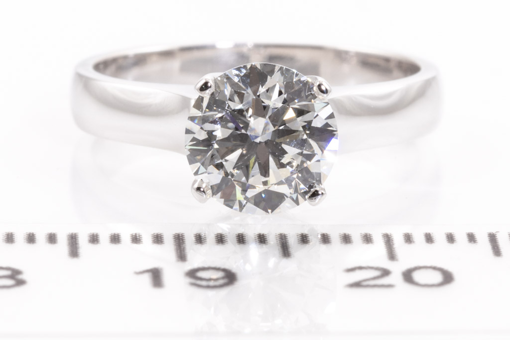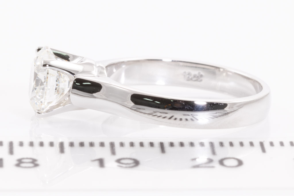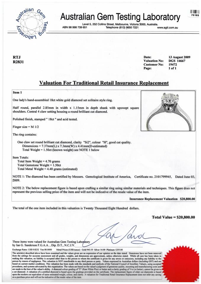 Diamond solitaire ring with round Diamond of 1.50ct (with GIA Report grading at H SI2 #2101799945). 18ct white gold. Ring size K. Weight 4.4g. With Valuation. (Pre-owned)