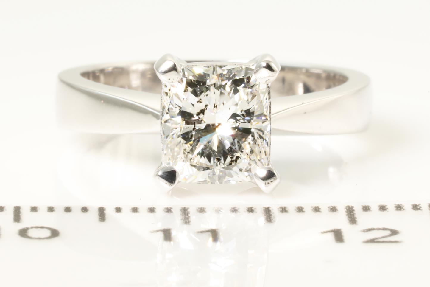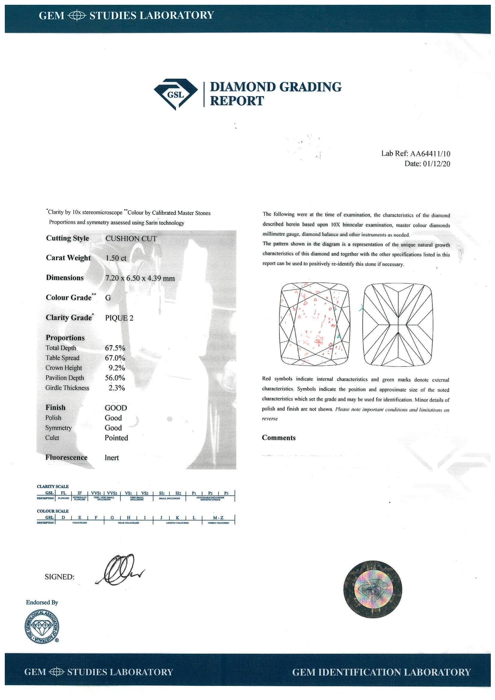 Diamond solitaire ring with a cushion cut Diamond of 1.50ct (With GSL report graded as G P2, #AA64411/10). 18ct white gold. Ring size M. Weight: 6.5g. (New)