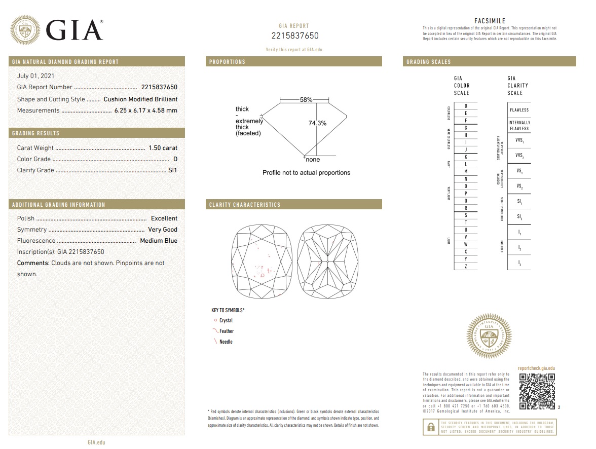 A loose cushion cut Diamond of 1.50ct (With GIA report graded as D SI1 #2215837650). (New)