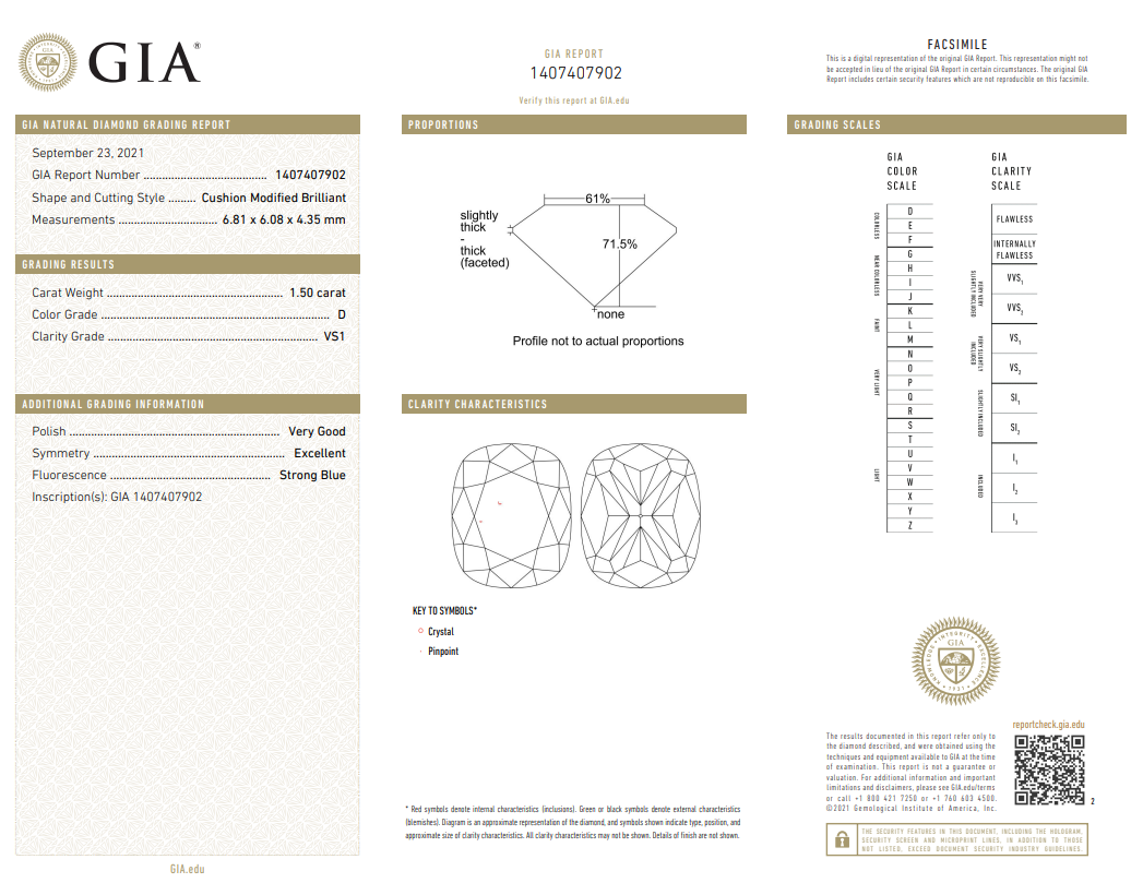 A loose cushion cut Diamond of 1.50ct (with GIA report graded as D VS1 #1407407902). (New)