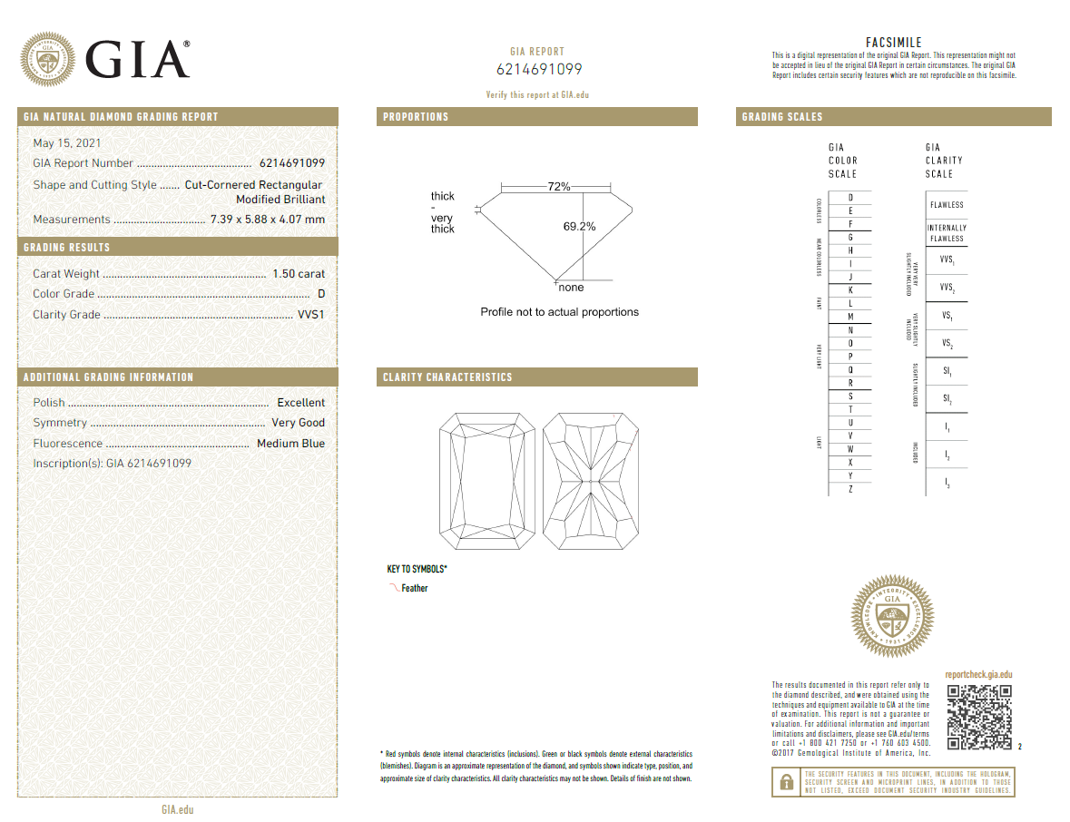 A loose Radiant Cut Diamond of 1.50ct (with GIA report graded as D VVS1 #6214691099). (New)