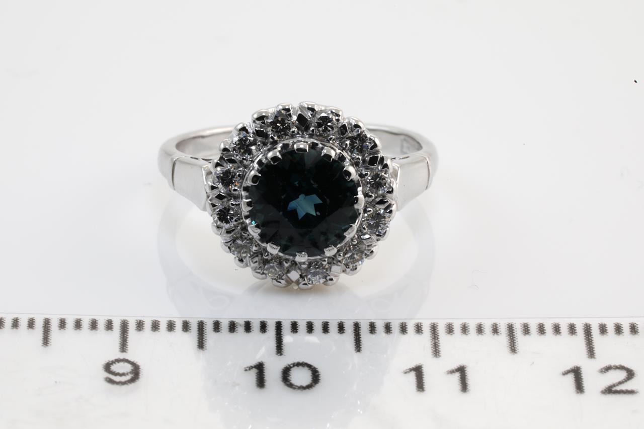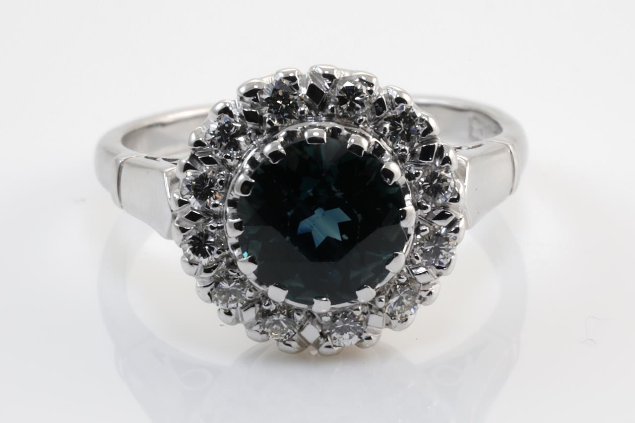 Sapphire and Diamond ring with round Sapphire of approximately 1.60ct and Diamonds totalling approximately 0.30ct (Estimated grading: G VS). 18ct white gold. Ring size L. Weight: 4.2g (Pre-owned)