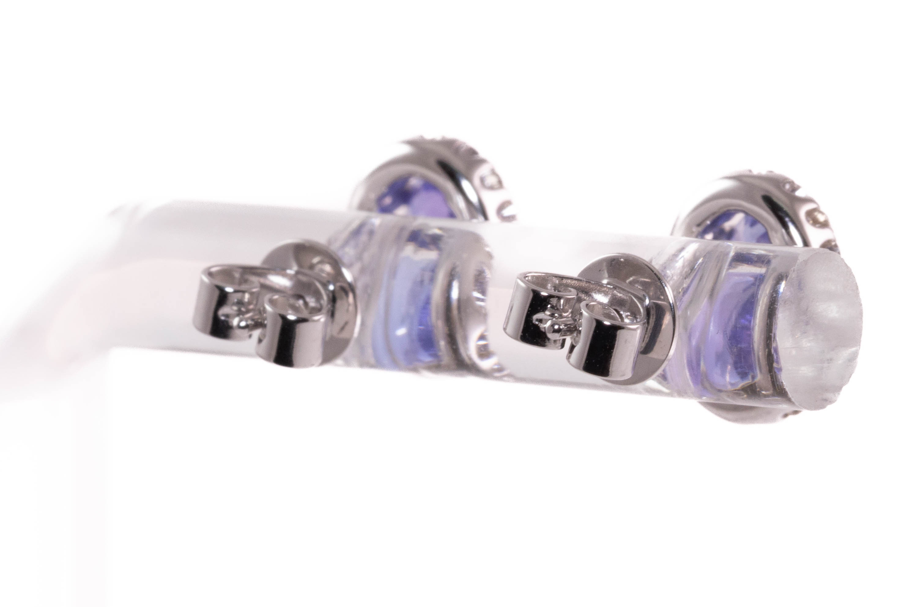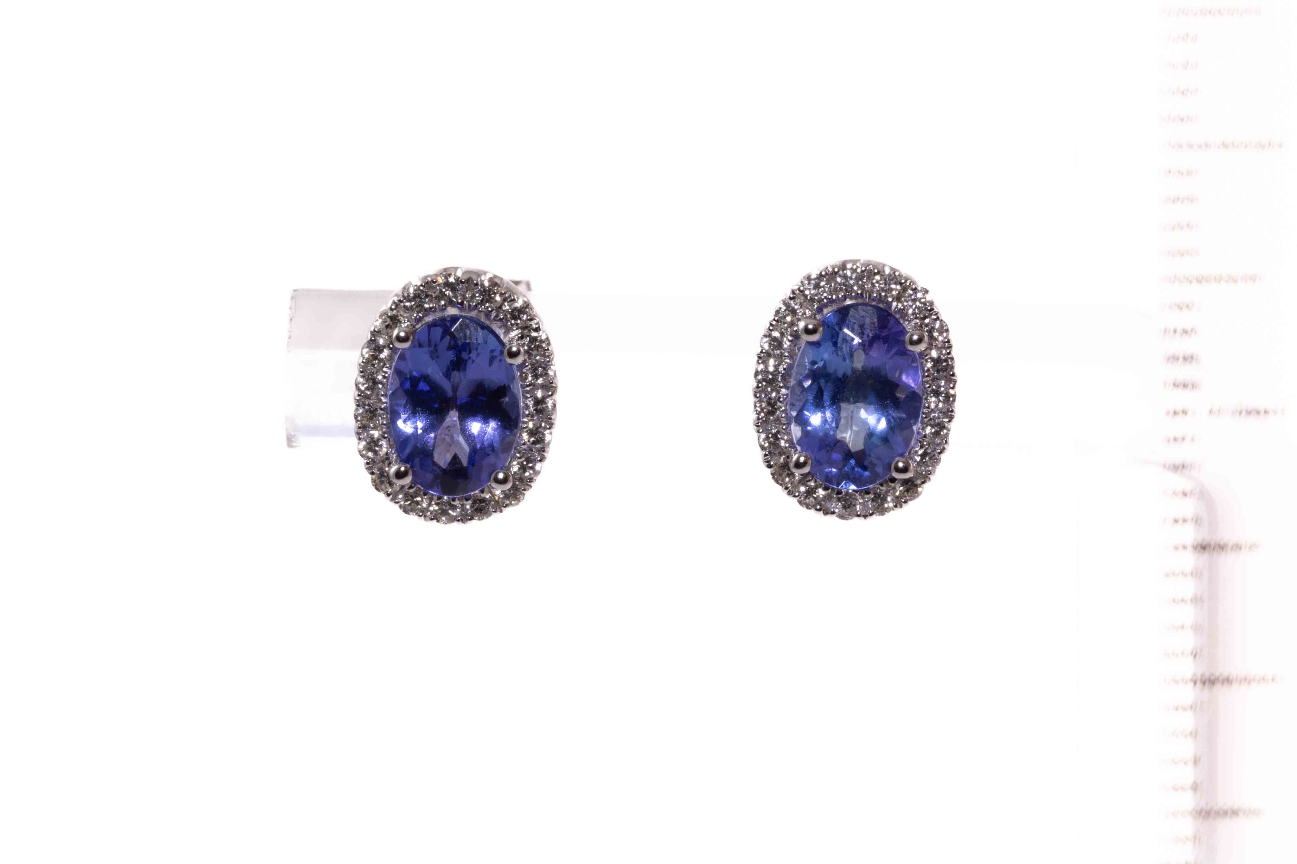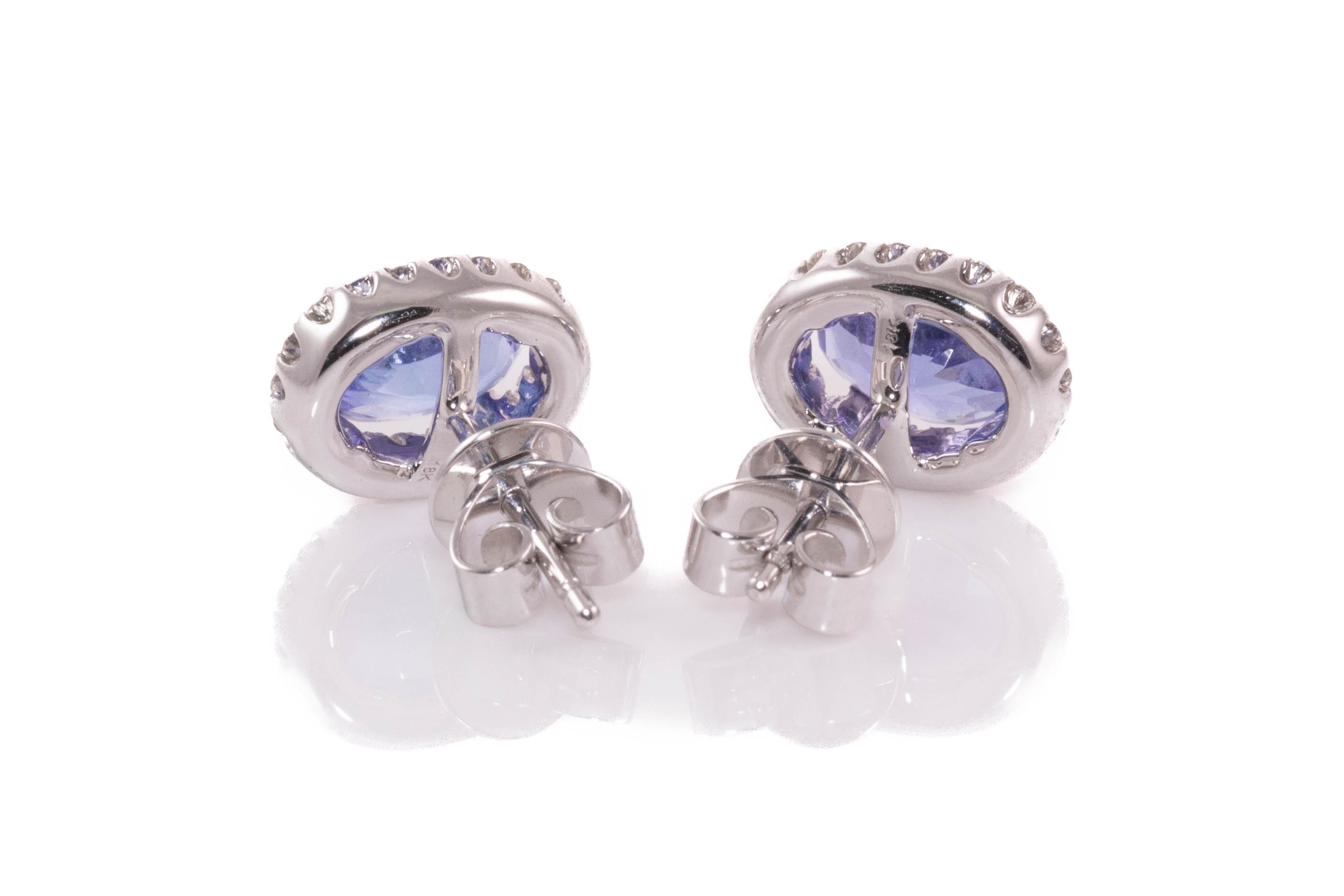 Tanzanite and Diamond earrings with oval Tanzanite totalling 1.50cts and round Diamonds totalling 0.29cts. 18ct white gold. Weight: 2.8g. (New)