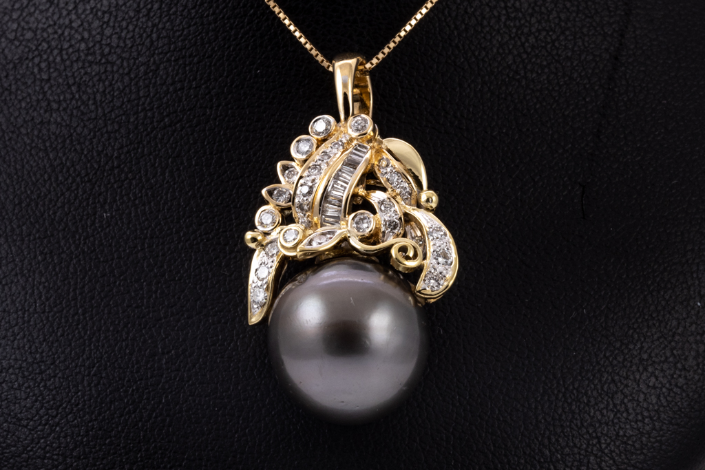 Pearl and Diamond enhancer pendant with round shaped Tahitian Pearl of 15.0mm and round & baguette cut Diamonds totalling approximately 0.70cts (Estimated grading : G SI. 18ct yellow gold with 44cm 18ct yellow gold chain. Weight 13.2g. (Pre-owned)