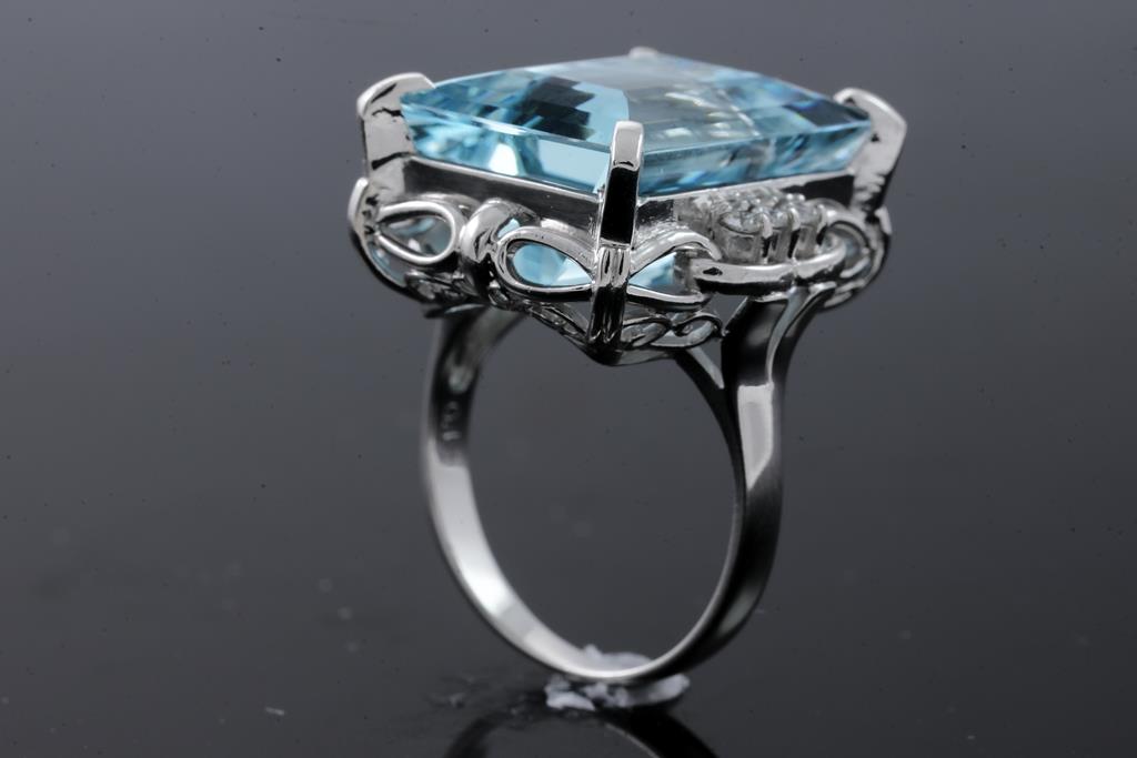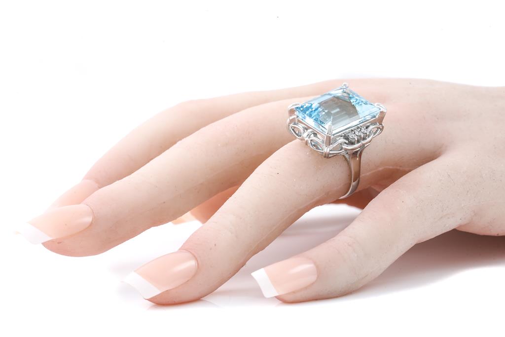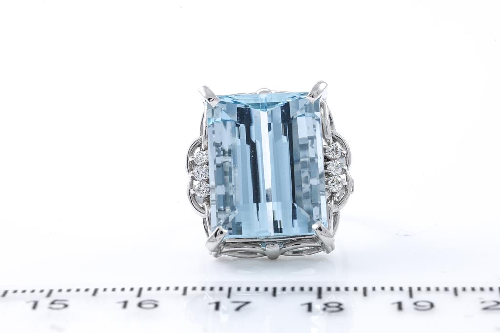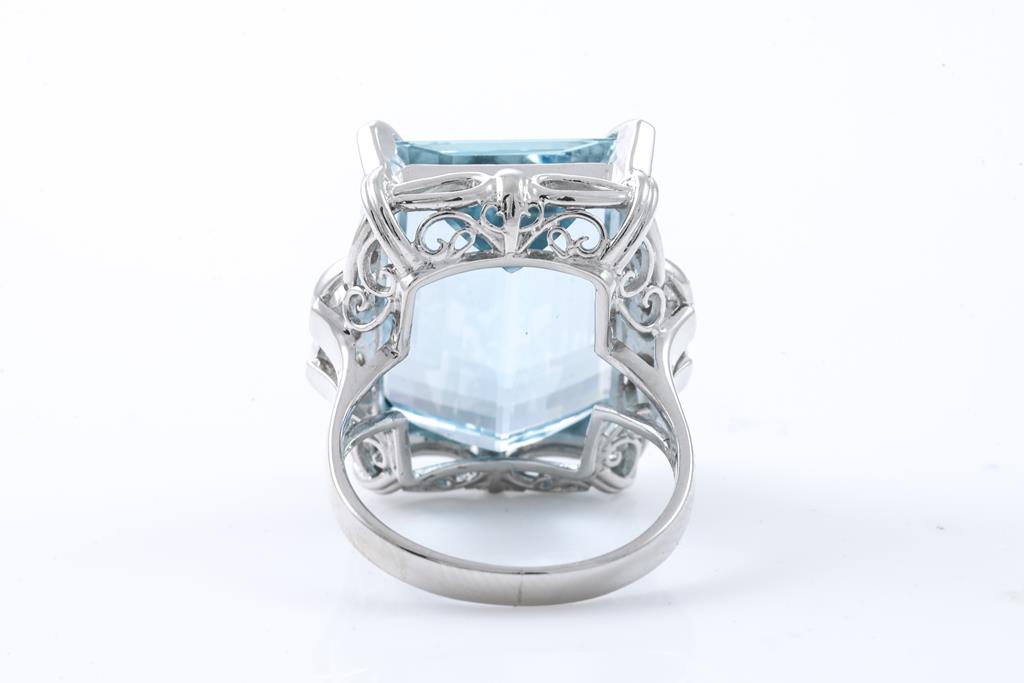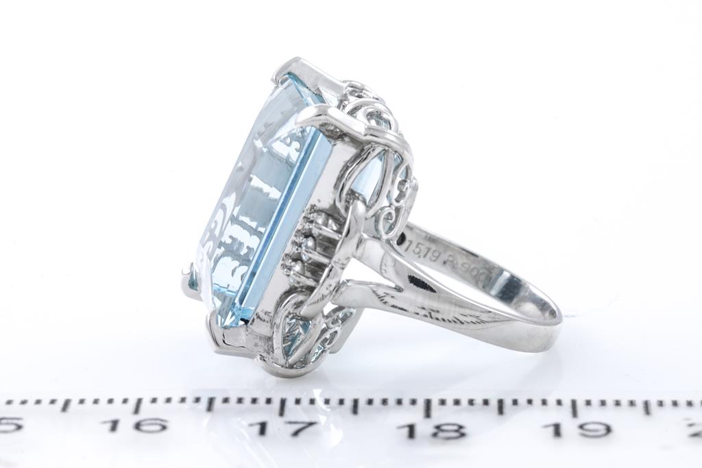 Aquamarine and Diamond ring with an emerald cut Aquamarine of 15.19ct and round Diamonds totalling 0.12cts. Platinum. Ring size J1/2. Weight: 11.5g. (Pre-owned)