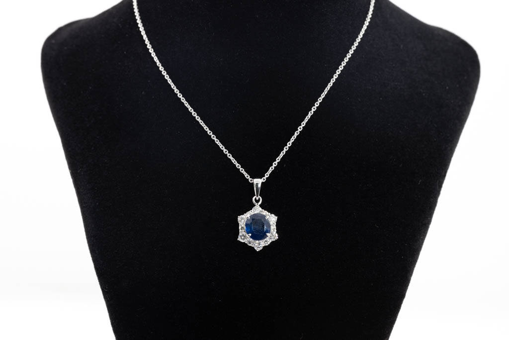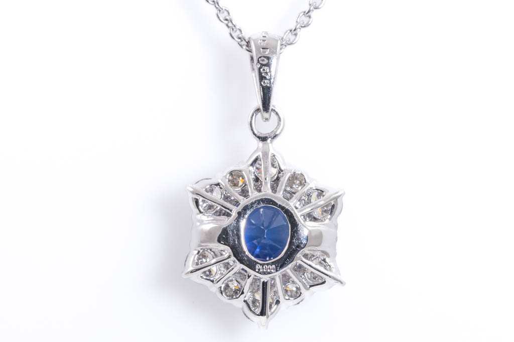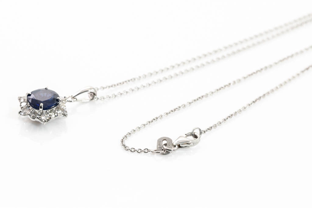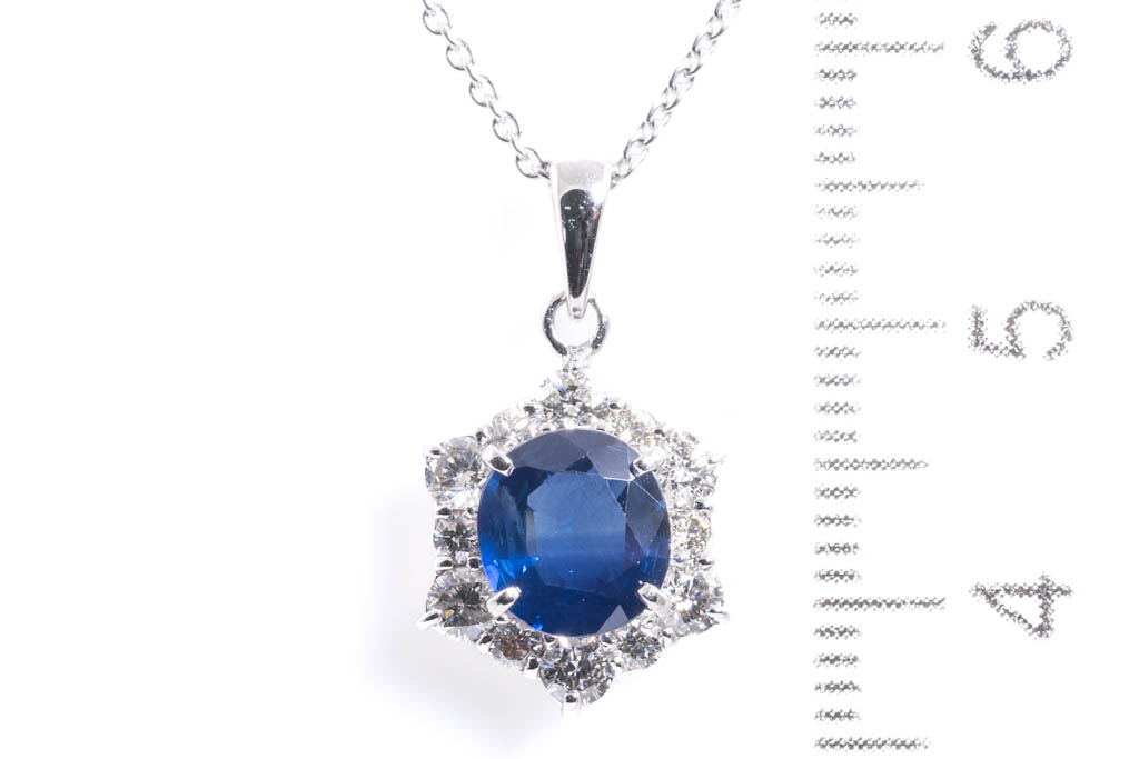 Sapphire and Diamond pendant with oval shape blue Sapphire of 1.51ct and round Diamonds totalling 0.57cts (Estimated grading: G-H VS-SI). Platinum-900 with 42cm 18ct white gold chain. Weight: 4.3g. (Pre-owned)
