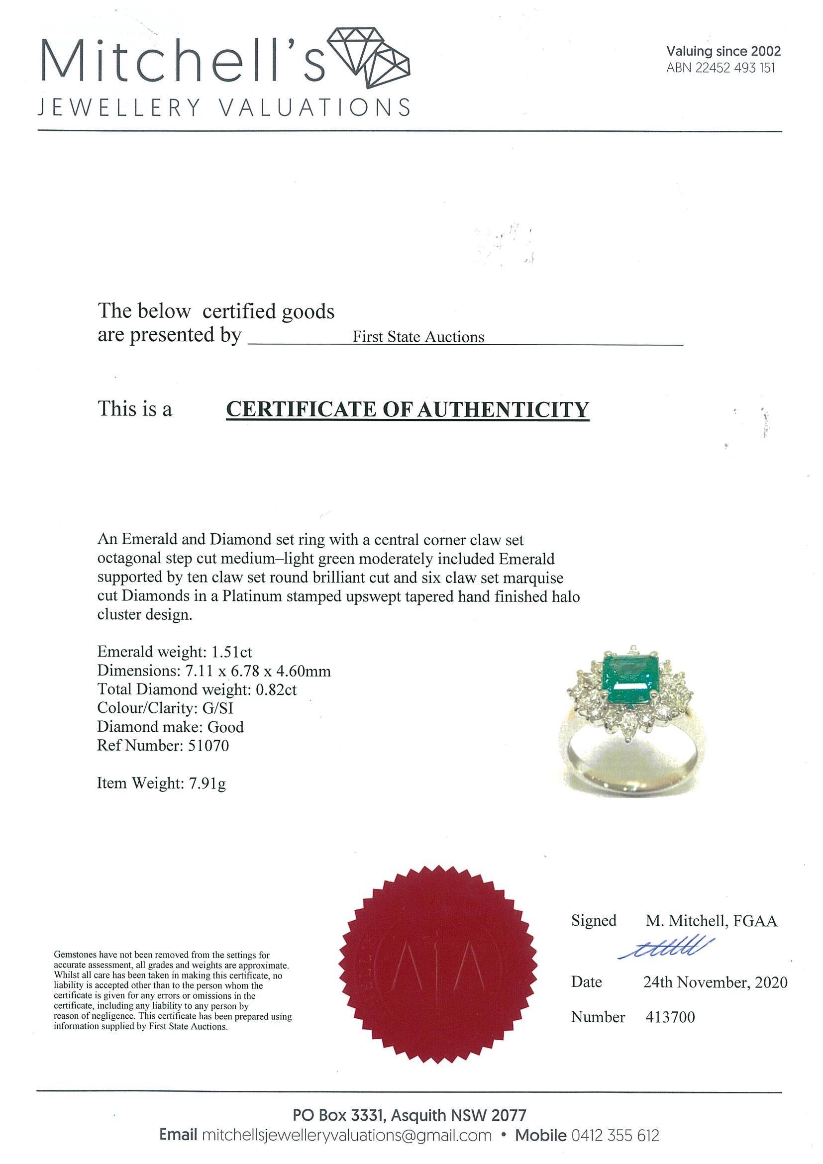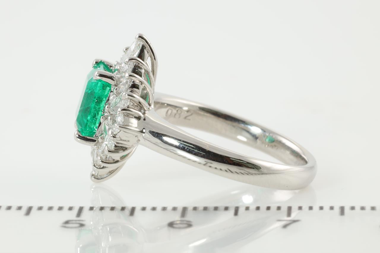 Emerald and Diamond ring with square emerald cut Emerald of 1.51ct and Diamonds totalling 0.82cts (Estimated grading: G SI). Platinum. With Certificate #413700. Ring size: L. Weight: 7.91g (Pre-owned)