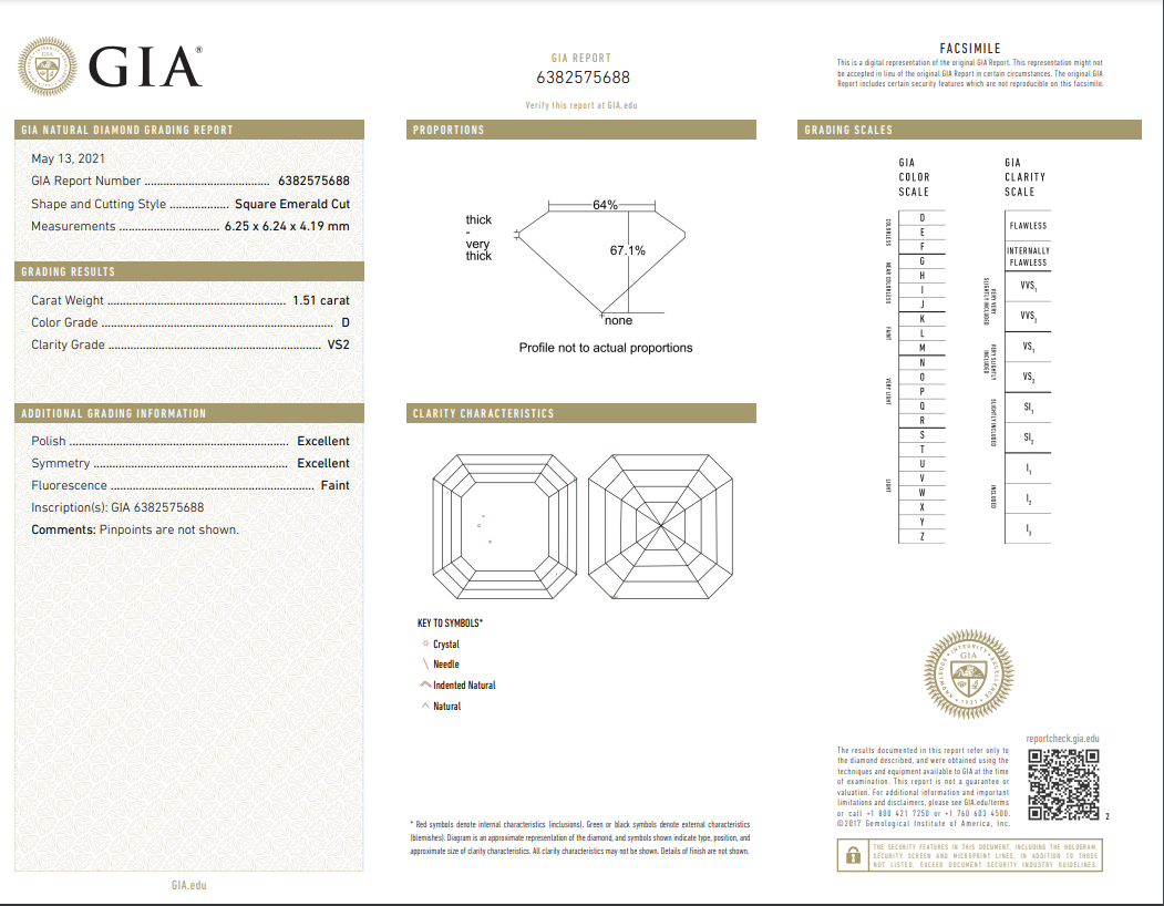 A loose Square Emerald cut Diamond of 1.51ct (With GIA report graded as D VS2 #6382575688). (New)