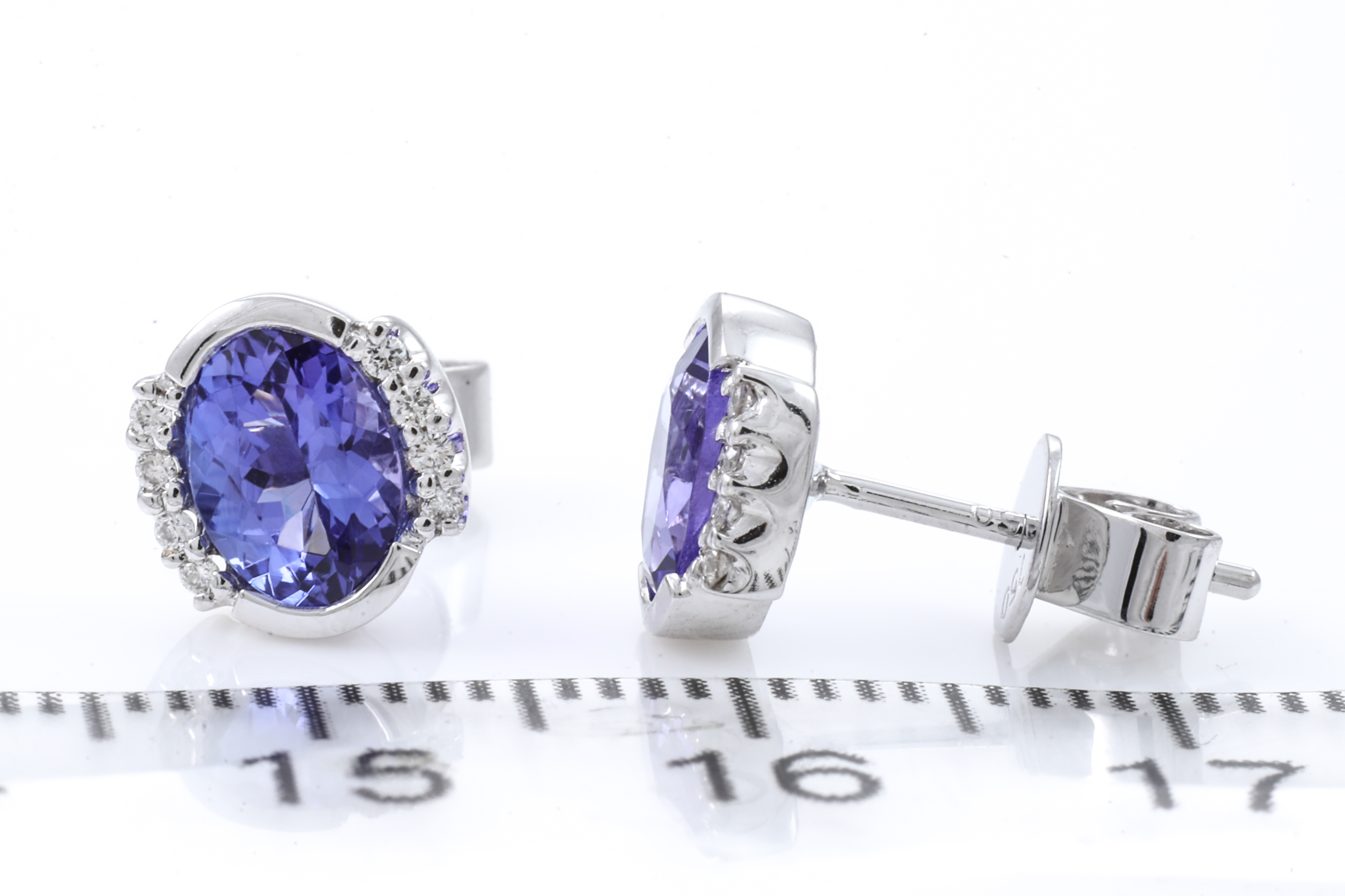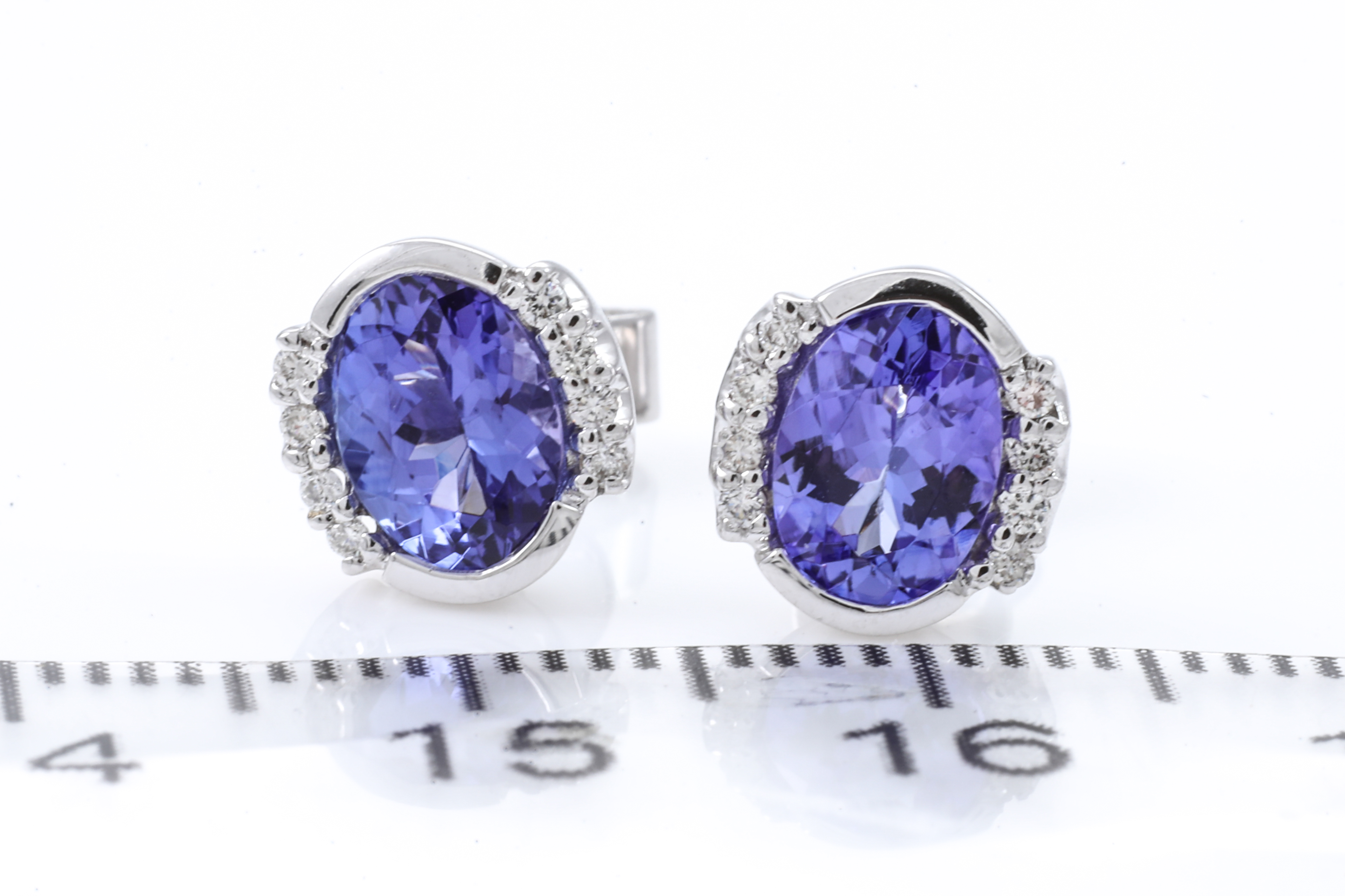 Tanzanite and Diamond earrings with oval Tanzanites totalling 1.51cts and round Diamonds totalling 0.09cts. 18ct white gold. Weight: 2.5g. (New)