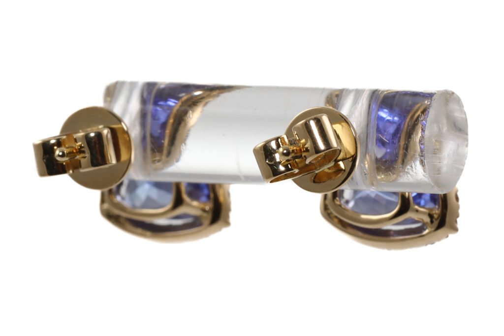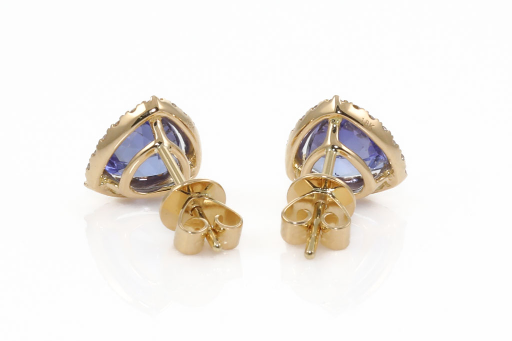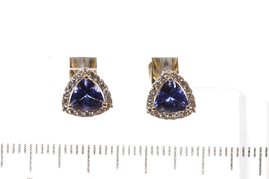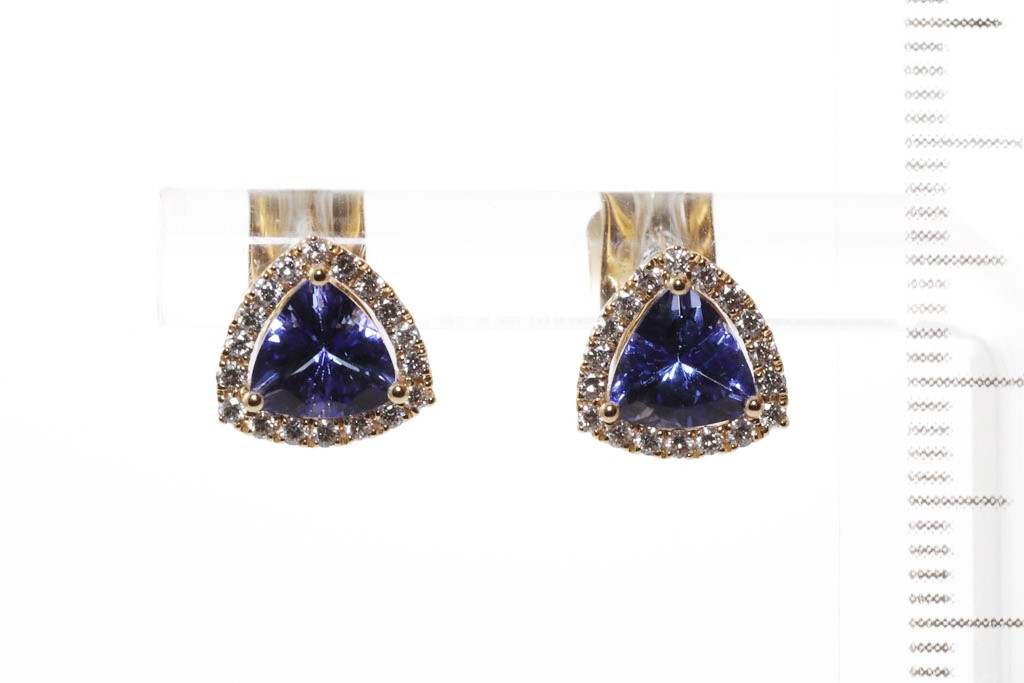 Tanzanite and Diamond earrings with trilliant Tanzanite totalling 1.51cts and round Diamonds totalling 0.28cts. 18ct yellow gold. Weight: 2.1g. (New)