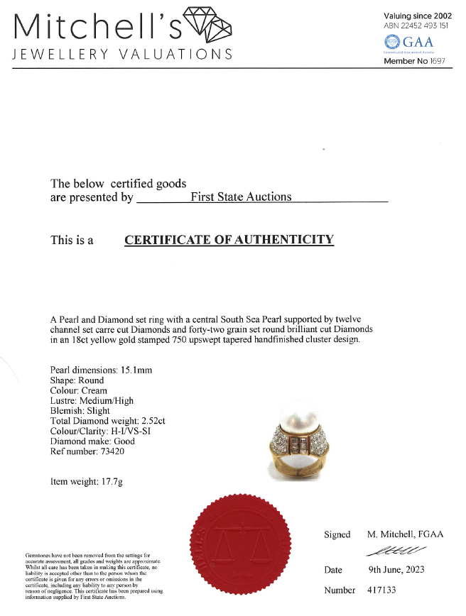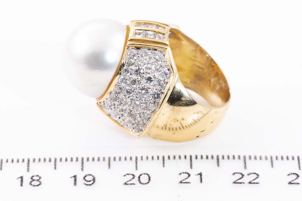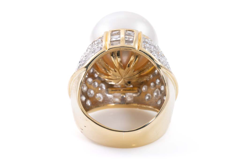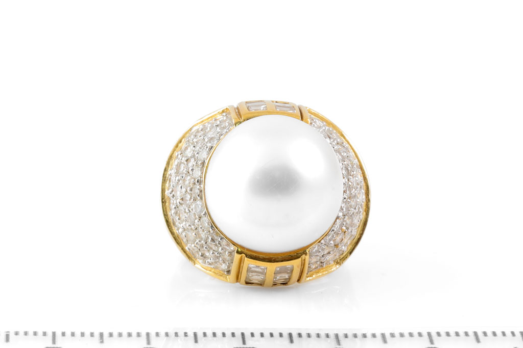 Pearl and Diamond ring with South Sea Pearl of 15.1mm and round, baguette & carre cut Diamonds totalling approximately 2.52cts (Estimated grading H-I VS-SI). 18ct yellow gold. Ring size I - ring resize is not recommended and ring with visible resize mark. Weight: 17.7g. With Certificate 417133. (Pre-owned)