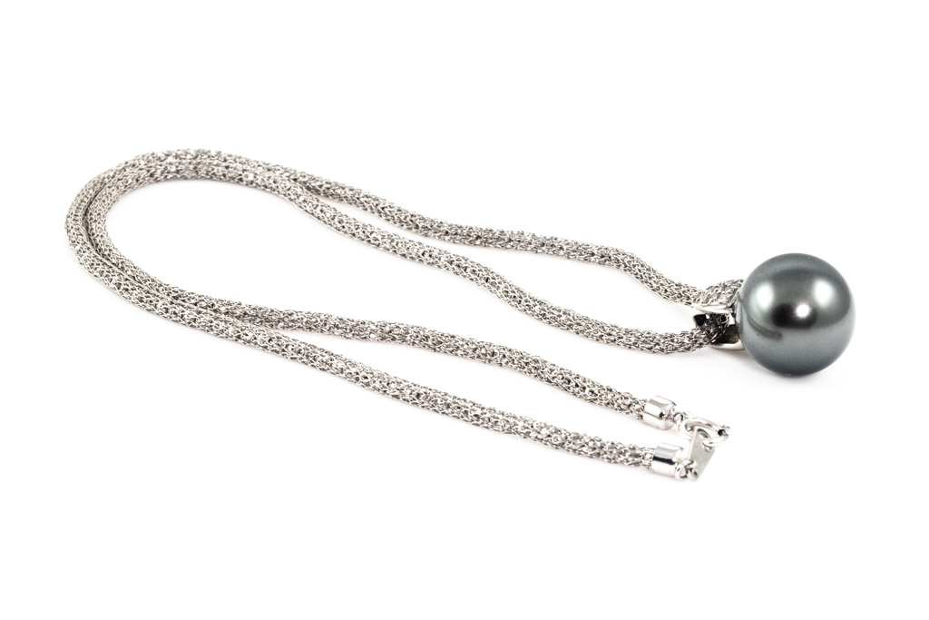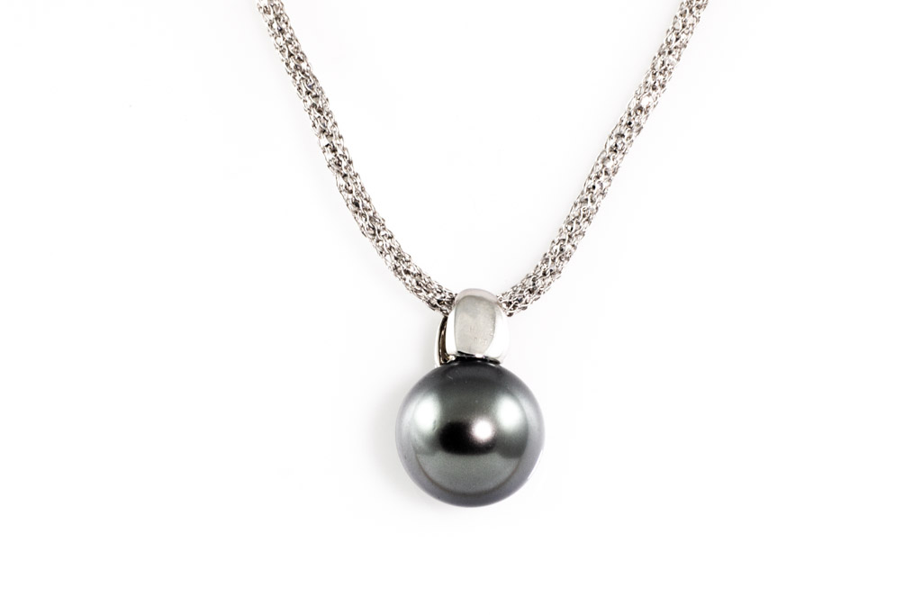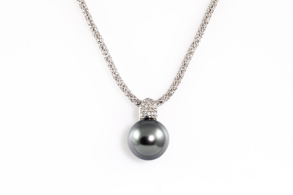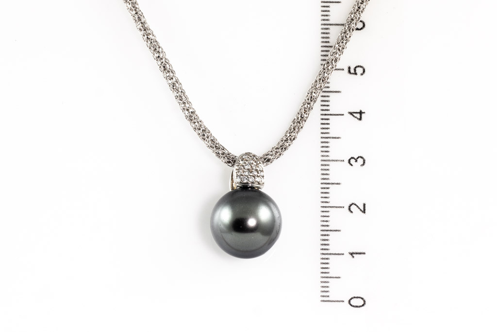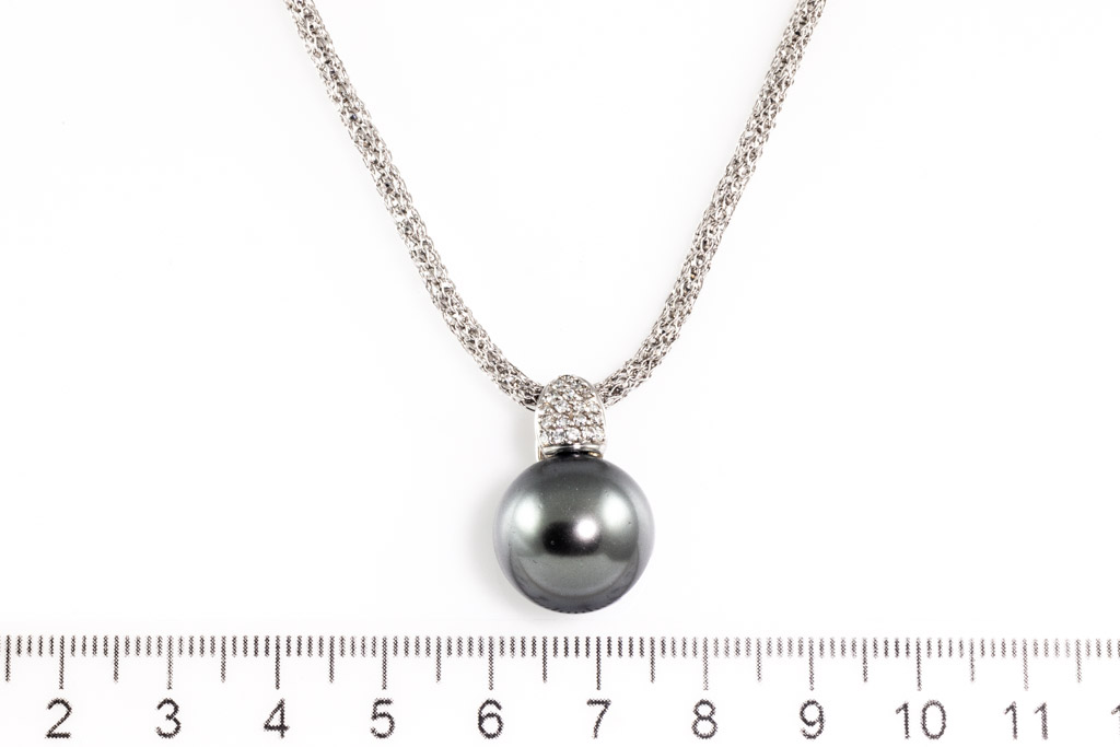 Pearl and Diamond pendant with Tahitian Pearl of 15.1mm and Diamonds totalling 0.19cts. 14ct white gold with 18ct white gold mesh chain. Length: 41cm. Weight: 17.9. (Pre-owned)