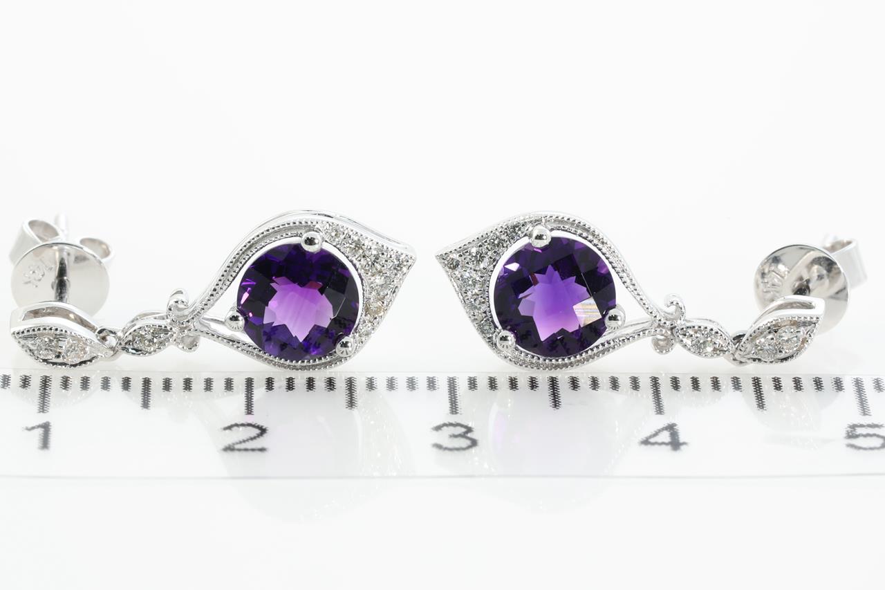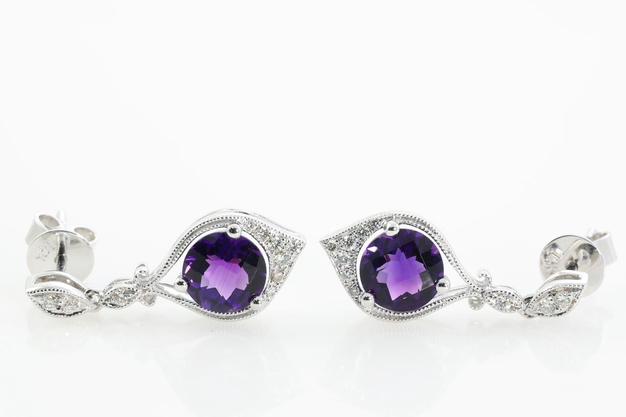 Amethyst and Diamond earrings with round Amethysts totalling 1.52cts and Diamonds totalling 0.12cts. 14ct White gold. Weight: 3.0g (New)
