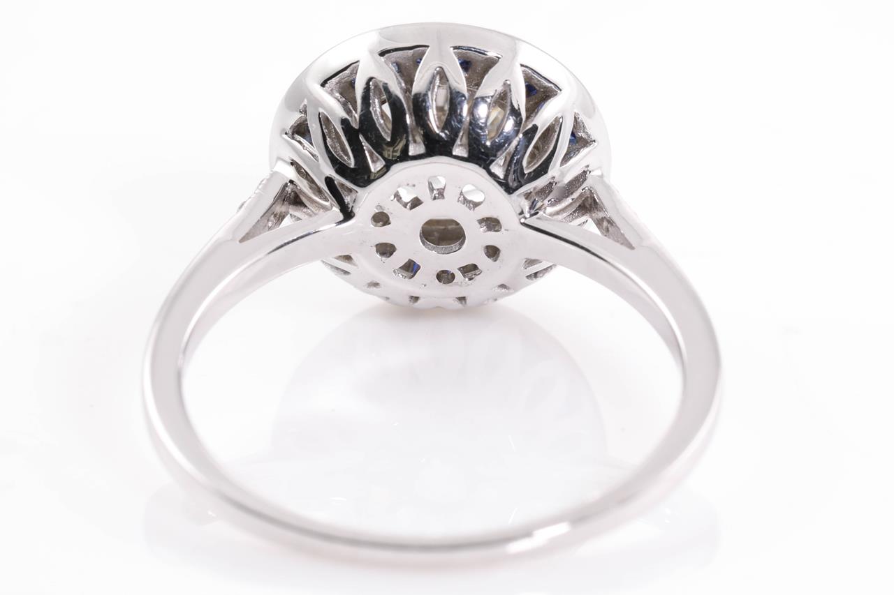 Diamond and Sapphire ring with centre round brilliant cut Diamond of 1.52ct (with GIA report graded as I VS1 # 2367336767) surrounded by fancy square cut Sapphires totalling approximately 0.48cts. 18ct white gold. Ring size O. Weight 4.3g. (Pre-owned)