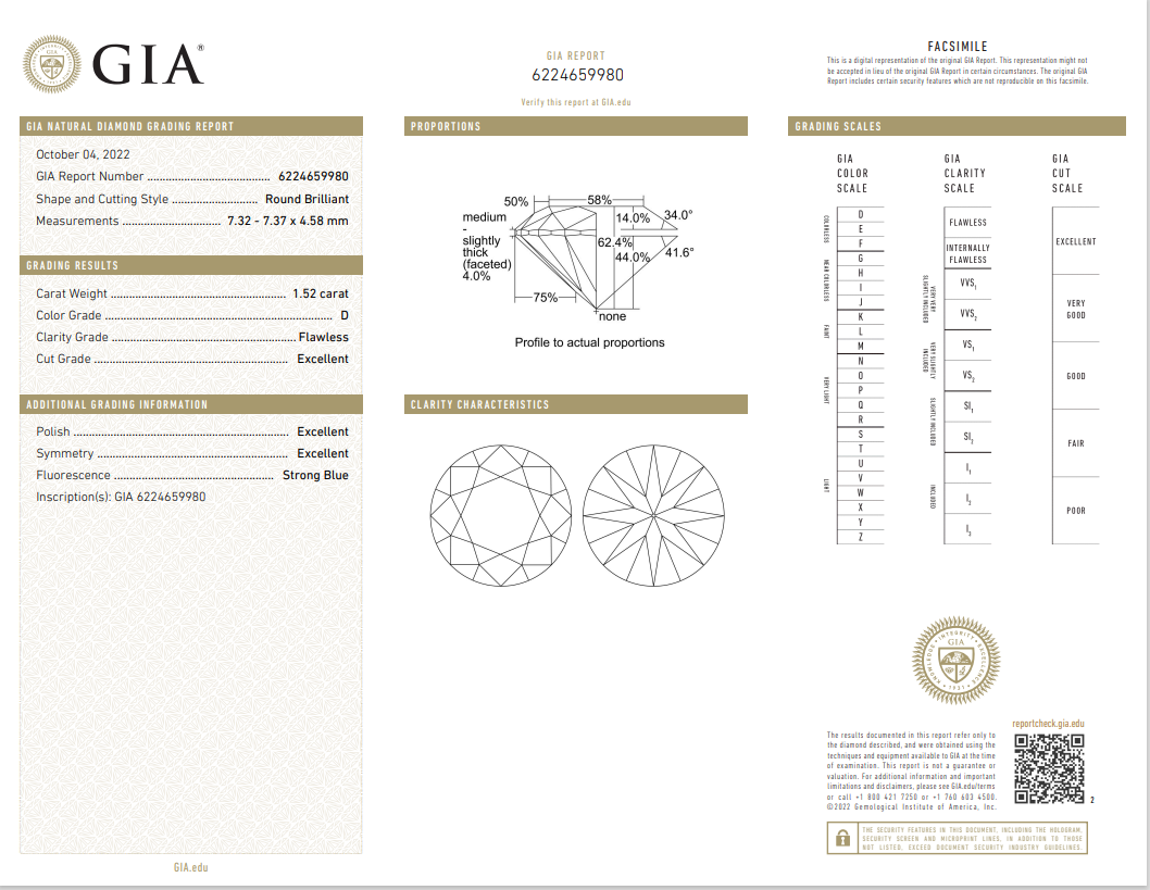 A loose round brilliant cut Diamond of 1.52ct (With GIA report graded as D FL #6224659980