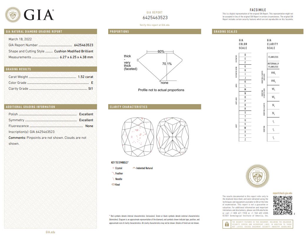 A loose cushion cut Diamond of 1.52ct (With GIA report graded as E SI1 #6425463523