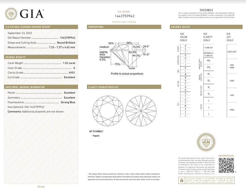 A loose round brilliant cut Diamond of 1.52ct (with GIA report graded as E VVS1 #1443759942