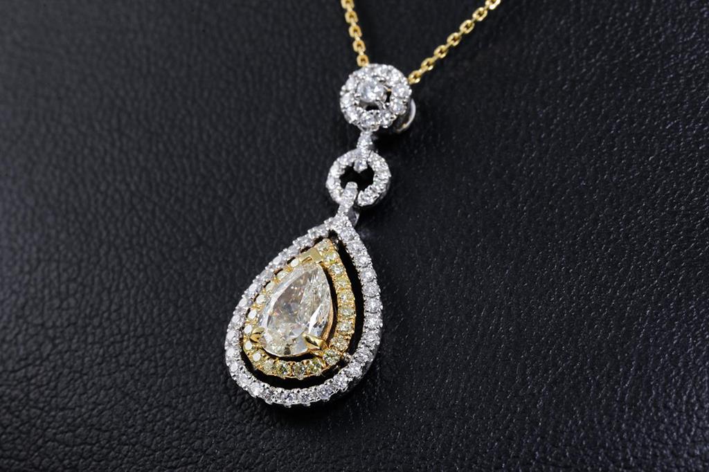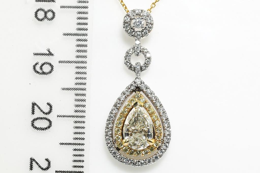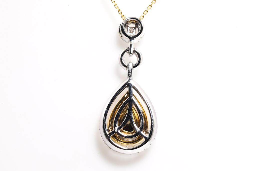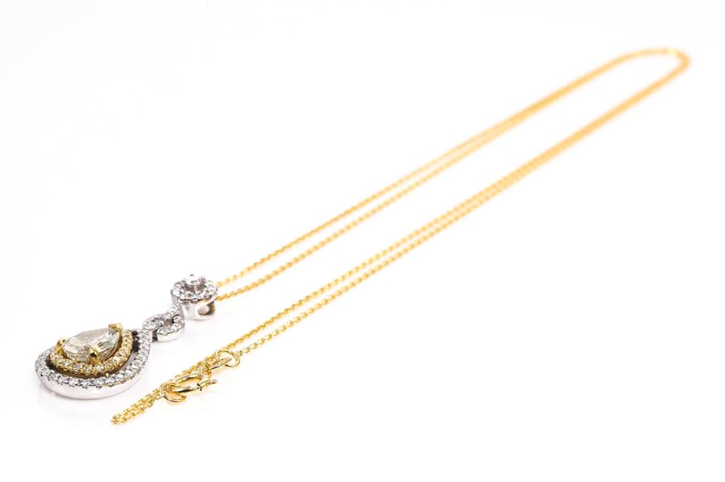 Diamond pendant with centre pear shape Diamond of 1.01ct (Estimated gradine: L P1) and remaining white & yellow round Diamonds totalling 0.51cts (Estimated grading: Fancy yellow-H SI-P1). 18ct yellow & white gold with 45cm yellow gold chain. Weight: 4.8g. With Certificate #415430. (As new)