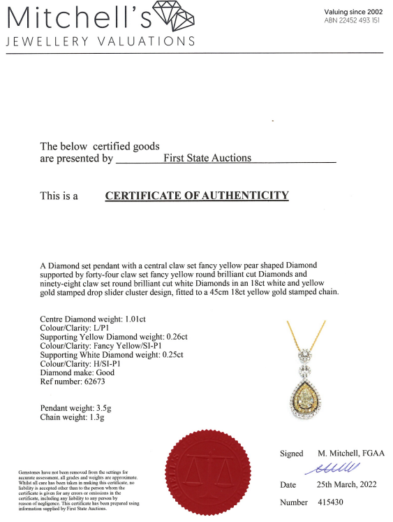 1.52ct Yellow & white Diamond Pendant | First State Auctions