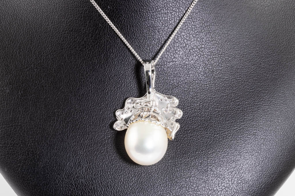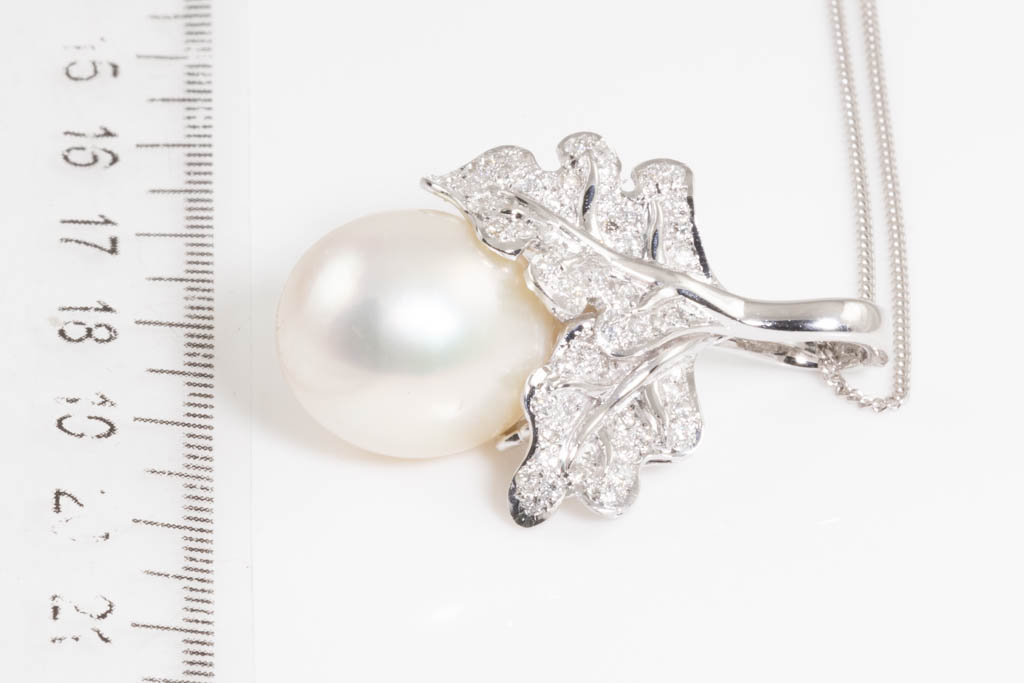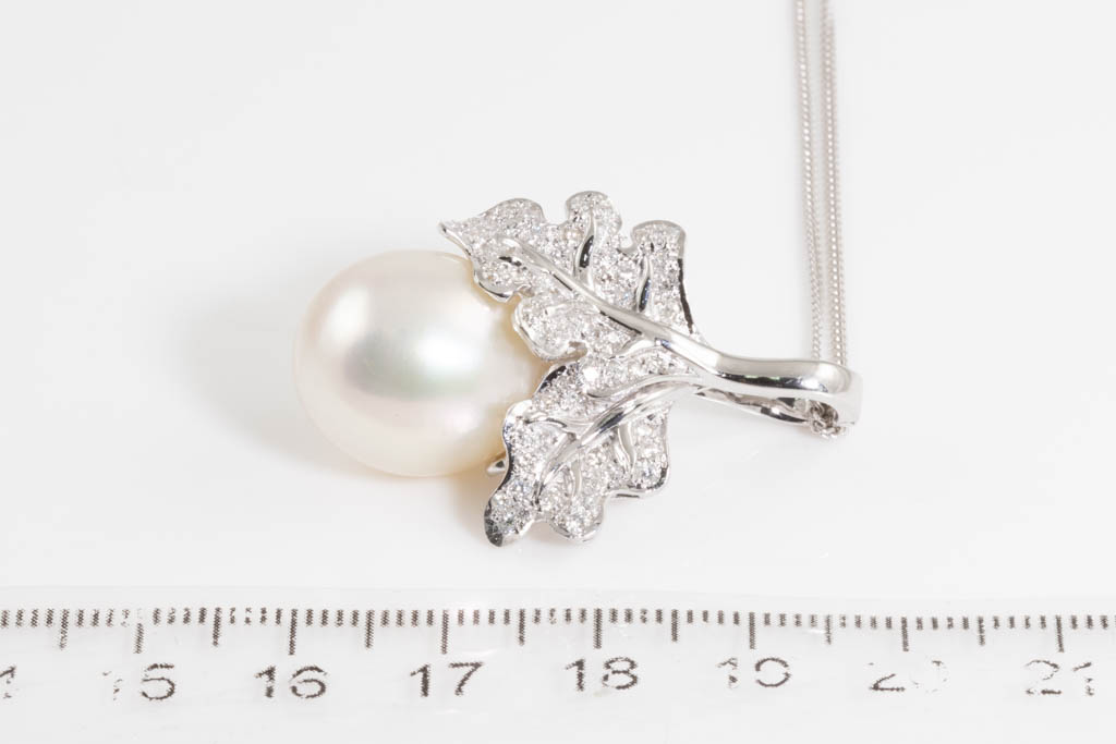 Pearl and Diamond pendant/enhancer with South Sea Pearl of 15.2mm and round Diamonds totalling 0.57cts (Estimated grading: G-H SI). Platinum with 41cm platinum adjustable chain. Weight: 19.0g. (Pre-owned)
